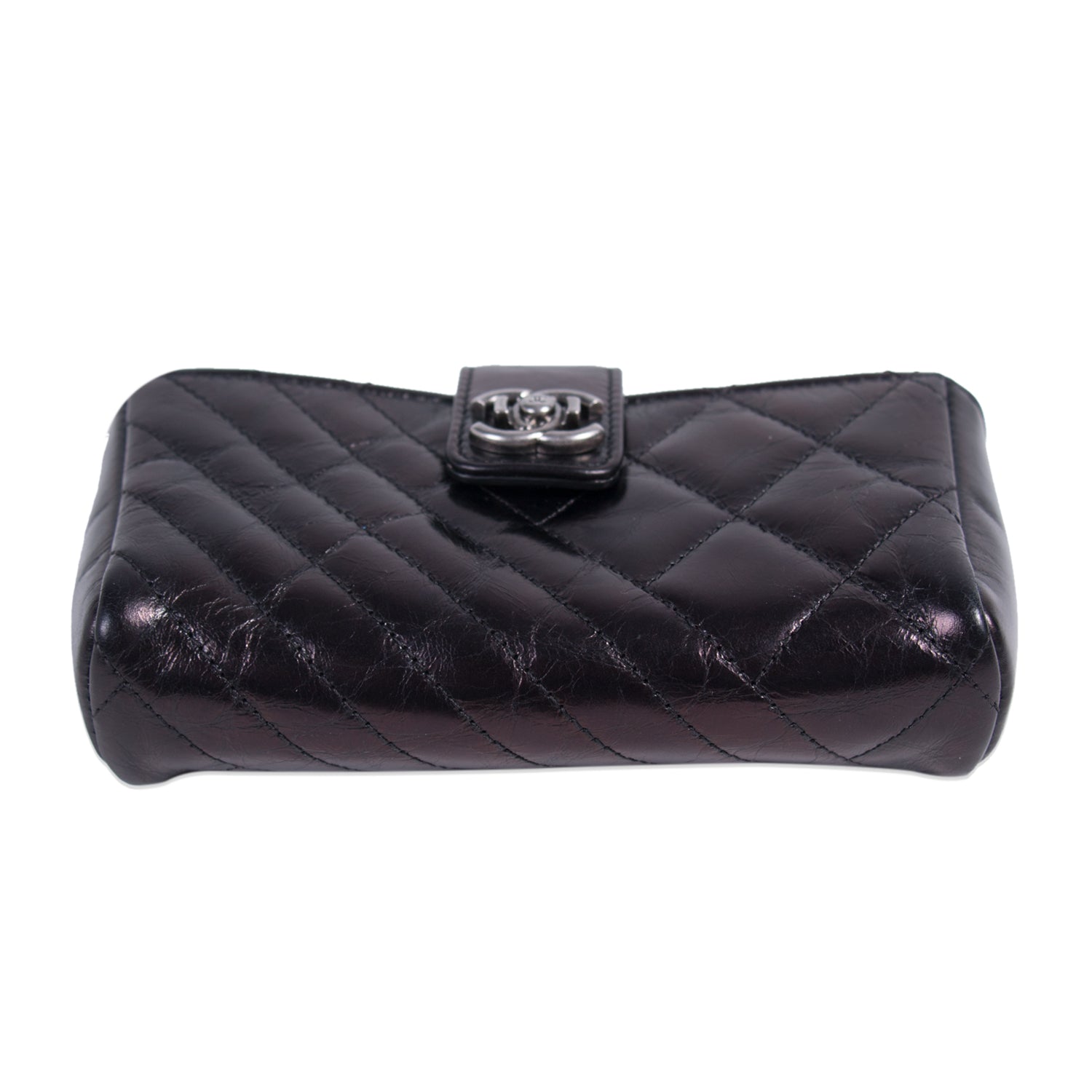 Details: Black Quilted Leather / Gunmetal Hardware / Suede Interior Lining / 3 Compartments, One with Zip Closure / Magnetic Snap Closure