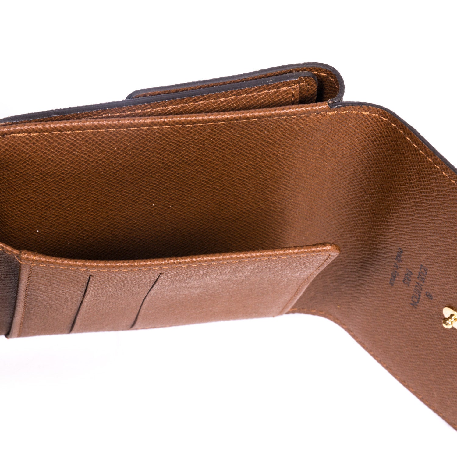 Details: Brown And Tan Monogram Coated Canvas / Brass Hardware / Snap Coin Pocket At Exterior / Brown Taiga Leather Lining / Single Interior Bill Compartment / Six Card Slots At Interior Walls / Snap Closure At Flap