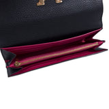 Details: Black Taurillon Leather / Gold-Tone Hardware / Logo at Front Flap / Fuchsia Leather Lining / Three Compartments, One with Zipper Closure / 12-Card Slots / Magnetic Snap Closure at Front Flap