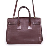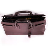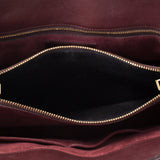 Details: Plum Leather / Small Size / Gold-Tone Hardware / Detachable Shoulder Strap / Dual Rolled Top Handles / Plum Suede Interior Lining / Three interior Compartments / One Compartment With Zip Closure One Top / One Compartment With Two Pockets At Interior Wall / One Compartment With Zip Closure At Interior Wall