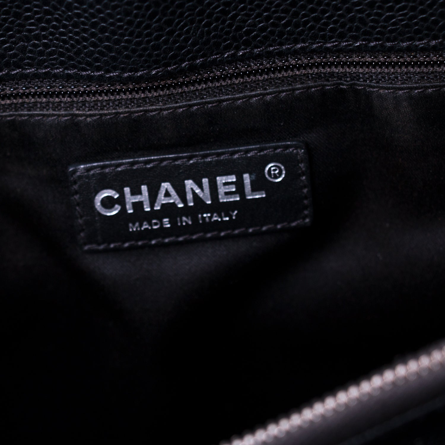 Details: Black Caviar Leather / Silver-Tone Hardware / Dual Chain-Link Leather Shoulder Straps / CC Logo at Front / Slit Pocket at Exterior Back / Fabric Interior Lining / Three Compartments One with Zipper Closure / Dual Pockets at Interior One with Zipper Closure / Open Top