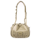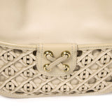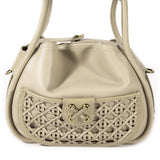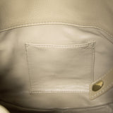 Details: Beige Calfskin Leather / Brass Hardware / Tonal Stitching / Grey Woven Accent At Base And Edges / Dual Rolled Handles / Detachable Adjustable Shoulder Strap With Metal / Exterior Pocket At Front With Snap Closure / Leather Interior Lining / Dual Pockets One With Zip Closure / Snap Closure At Top