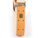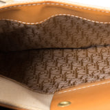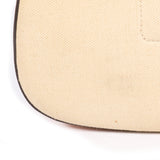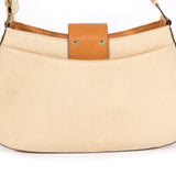 Description: Light Beige Shoulder Bag / Brown Leather Trim / Gold-Tone Hardware / Woven Lining / Interior Zip Pocket / Magnetic Snap Closure at Front Flap