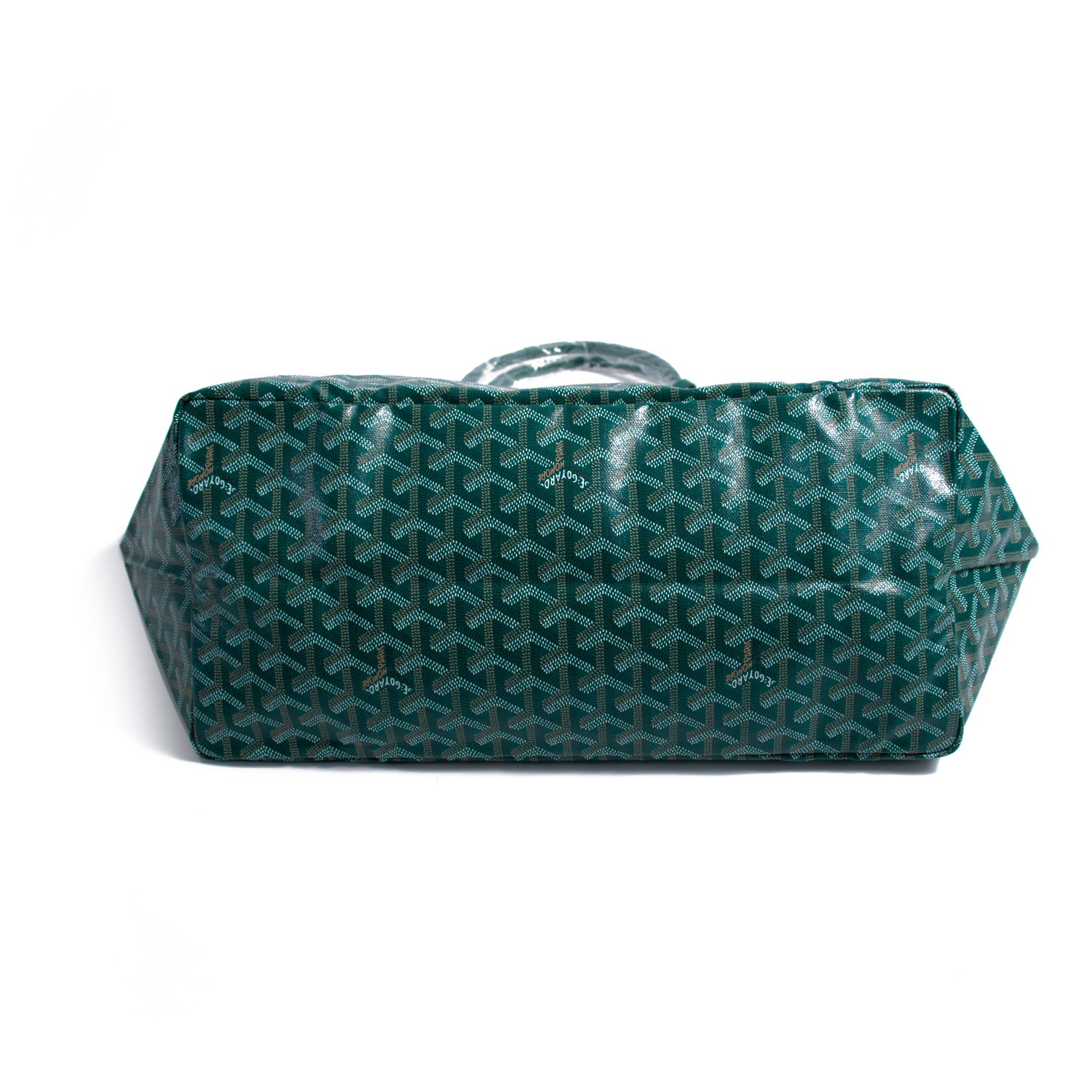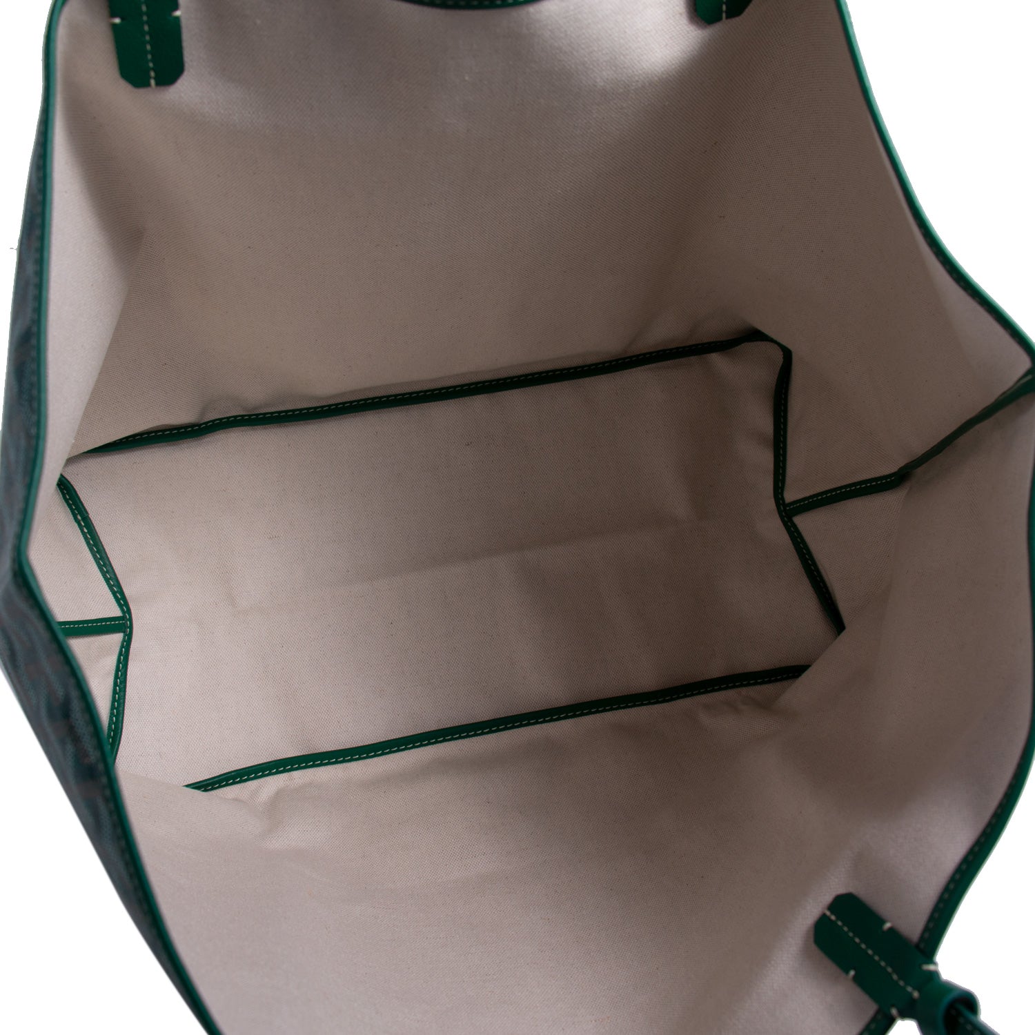 Details: Green and White Goyardine Coated Canvas / Green Leather Trim / Dual Rolled Handles / Single Compartment / Natural Fabric Lining / Detachable Pocket / Open Top