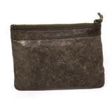 Details: Grey Leather / Brass Hardware / Exterior Zip Pocket At Front / Single Compartment / Black Fabric Interior Lining / Zip Closure At Top