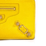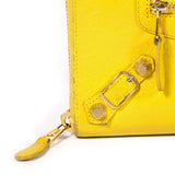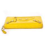 Details: Yellow Leather / Gold-Tone Hardware / Single Exterior Small Pocket At Front Face / Buckle And Stud Embellishments At Front / Yellow Leather Lining With Black Fabric At Interior / Twelve Card Slots / Four Compartments, One With Zip Closure / Zip Closure Around