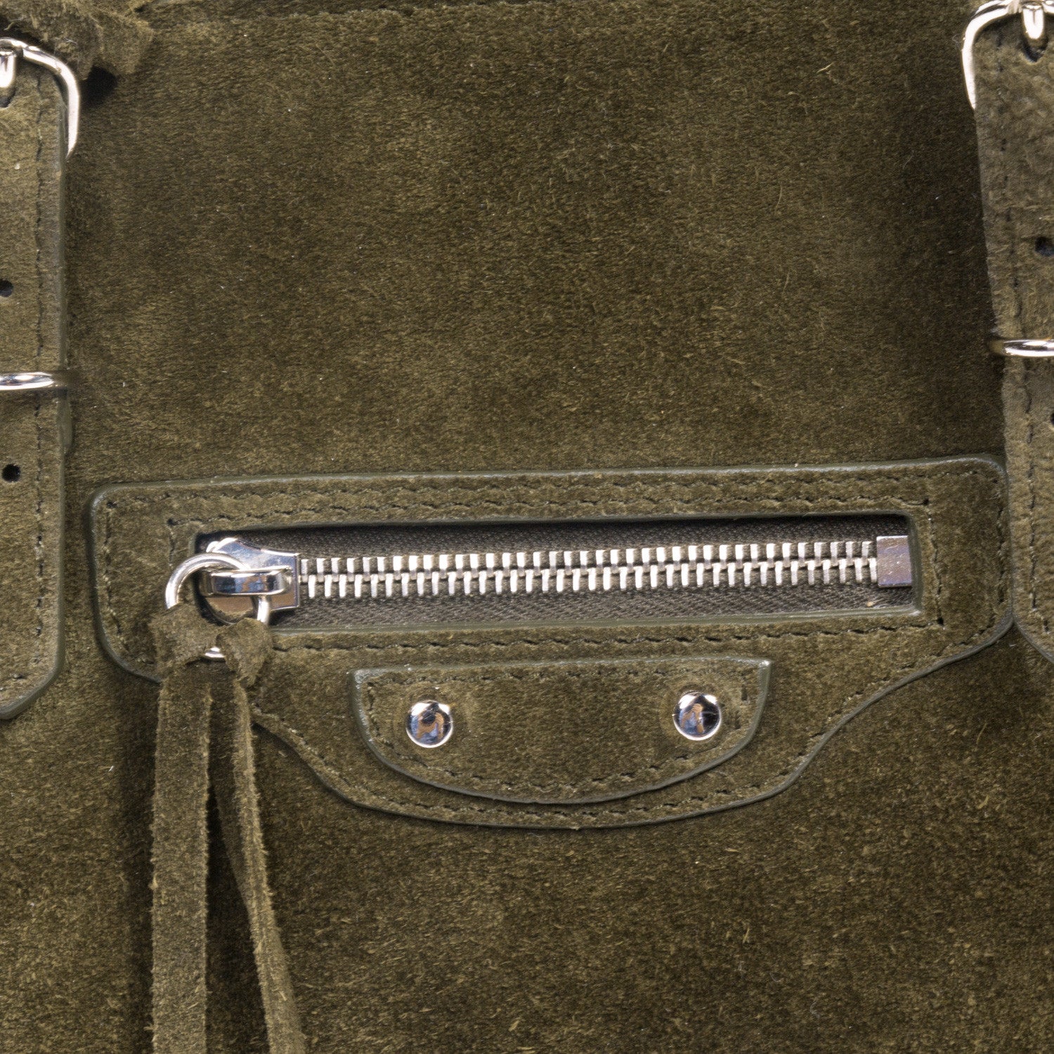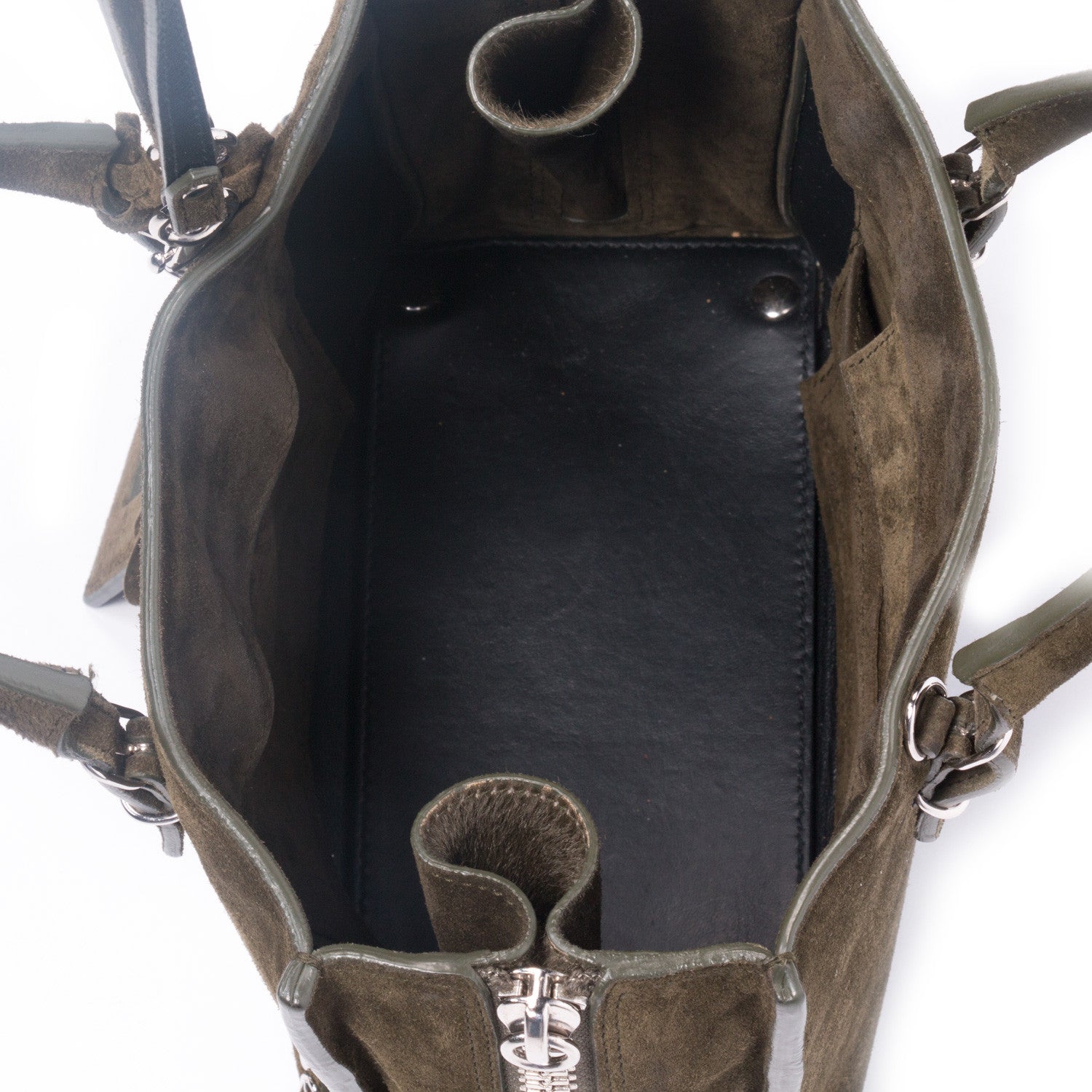 Details: Vert Olive Suede Tote / Silver-Tone Hardware / Adjustable Removable Shoulder Strap / Buckled Dual Rolled Handles / Single Pocket at Exterior With Zip Closure / Stud And Buckle Embellishments at Front / Dual Zip Expansions at Sides / Vert Olive Suede Inside / Black Leather Interior Base / Single Slit Pocket at Interior Wall and Open Top