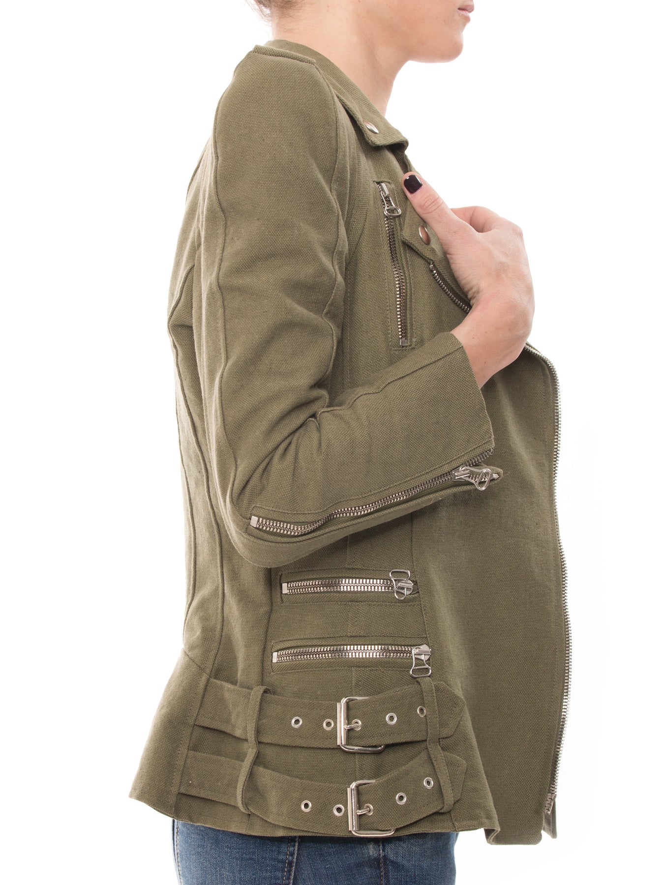 Details: Military Green Balmain Jacket With Side Zipper / Shoulder Epaulettes with Padding / Dual Zippers Pocket on The Chest / Dual Zippers on The Hip From Both Side / Dual Metal Military Stars on The Left Sleeve / Three Quarter Sleeves with Zipper