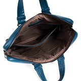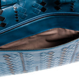 Details: Navy Blue and Black Intrecciato Leather / Black Metal Hardware / Dual Rolled Handles / Detachable Adjustable Shoulder Strap / Brown Fabric Lining / Dual Zipper Pockets at Front and Back / Zipper and Two Flat Pockets at Interior / Dual-Way Zipper Closure at Top