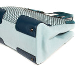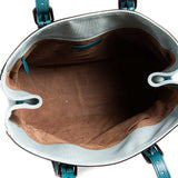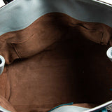 Details: Teal Intrecciato Canvas / Gunmetal Hardware / Dual Adjustable Top Handles / Leather Trim / Zipper Pocket at Front / Brown Suede Interior Lining / Single Compartment / Zip Pocket with Dual Flat Pockets / Open Top