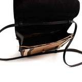 Details: Black Leather / Gold-Tone Hardware / Detachable Leather Strap / Zipper Pocket at Exterior Back / Vintage Check Canvas Trim / Dual Compartments / Black Suede Interior Lining / Slit Pocket / Clasp Closure at Front