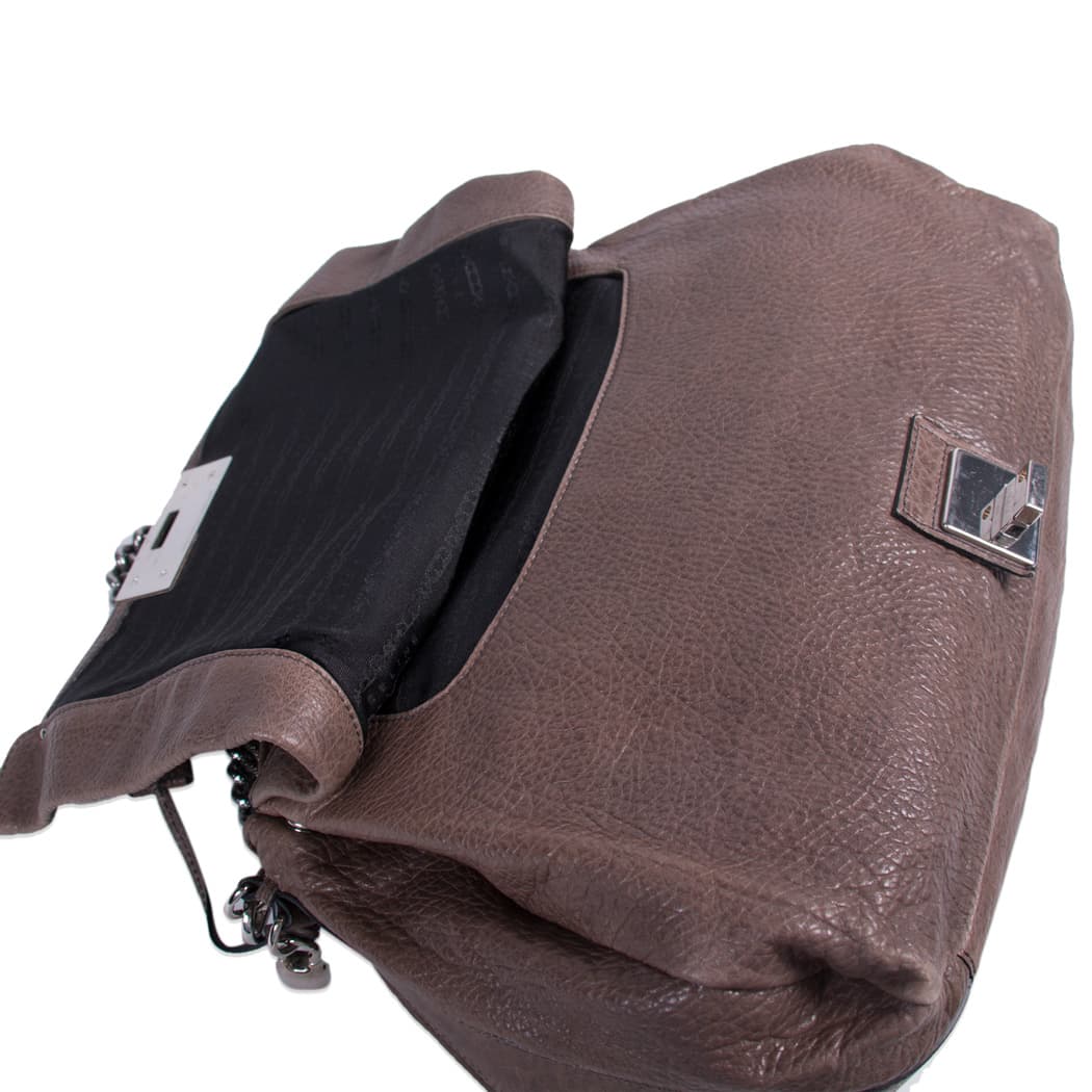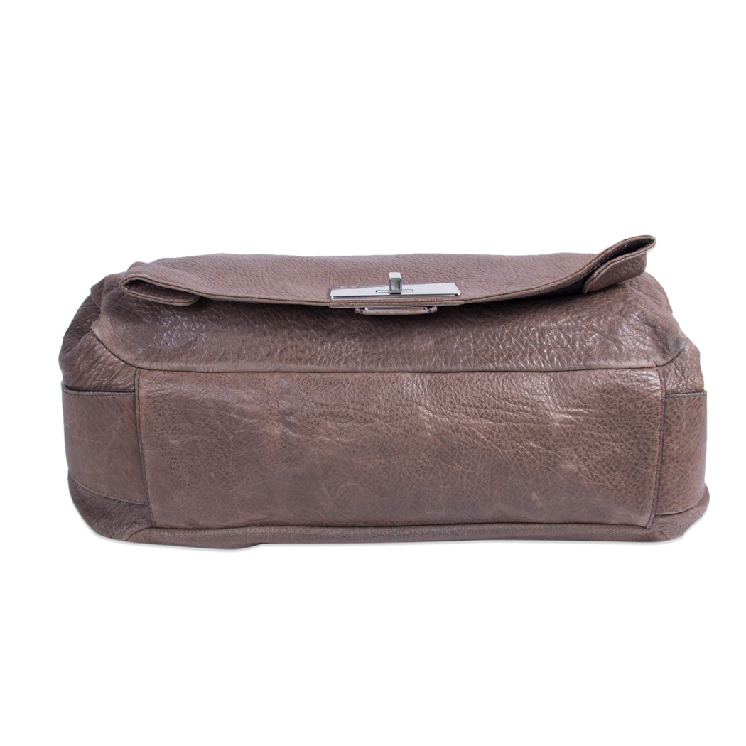 Details: Dark Grey Structured Leather / Gunmetal Hardware / Dual Rolled Handles / Detachable Shoulder Strap / Front Pocket with Flap / Three Compartments, One with Zipper Closure / Dual Flat Pockets