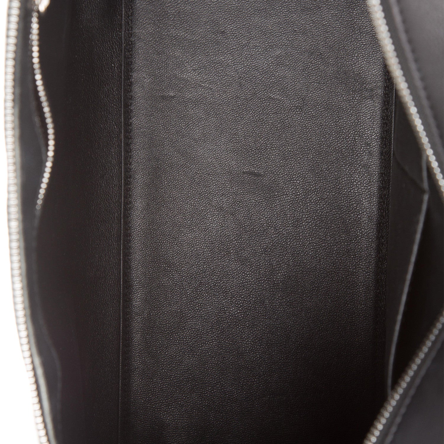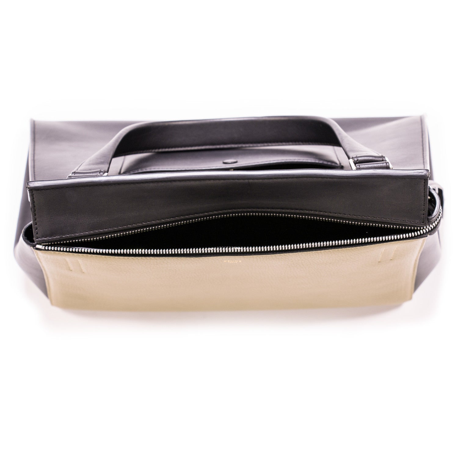 Details: Black and Beige Calf Leather / Silver Tone Hardware / Single Flat Shoulder Strap / Single Back Pocket With Snap Closure / Black Leather Interior Lining / Dual Pockets at Interior Walls / Single Interior Zipper Pocket / Zip Closure at Top
