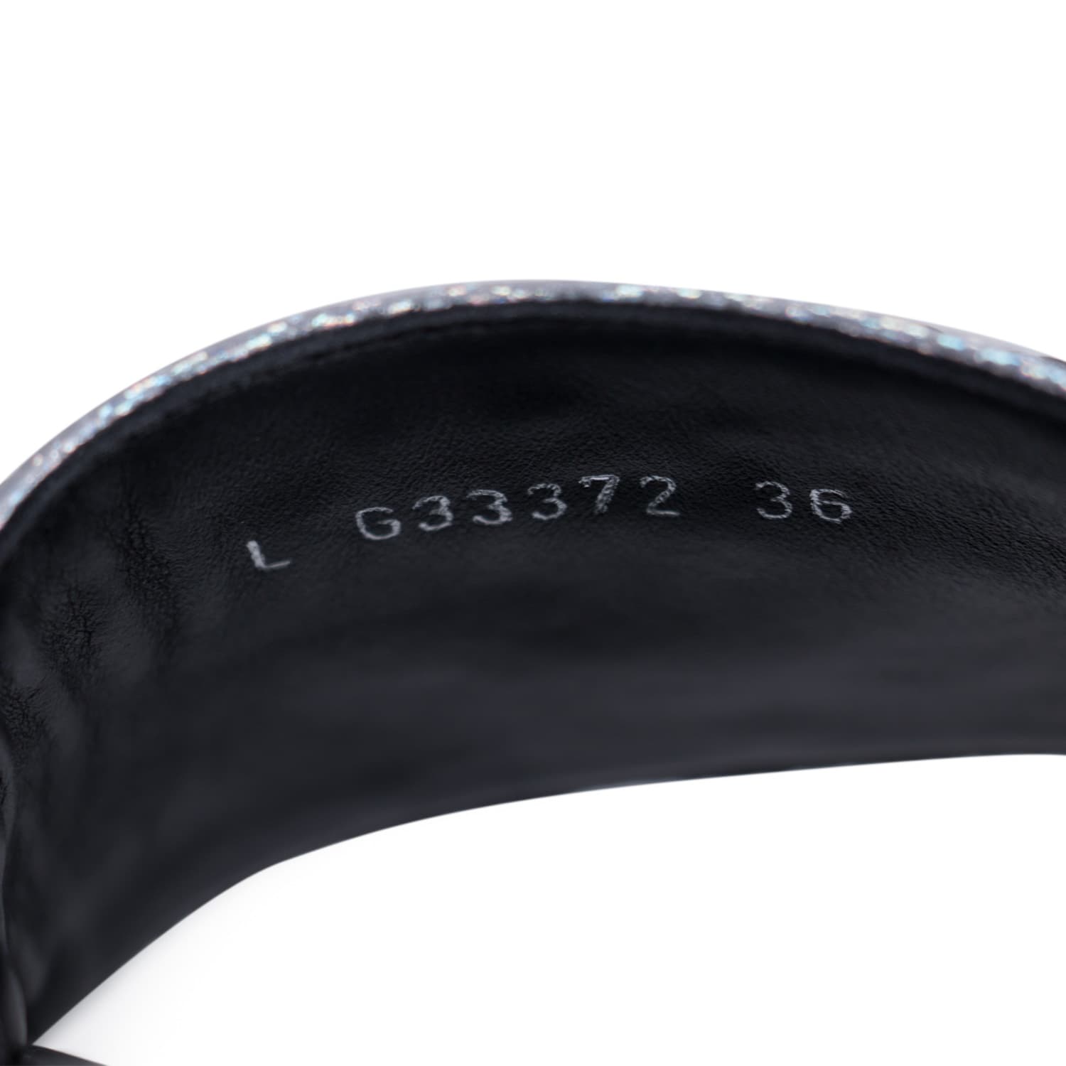 Details: Metallic Silver Leather / Silver-Tone Chain-Link Accent at Front / CC Charm / Rubber Sole