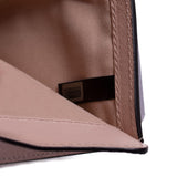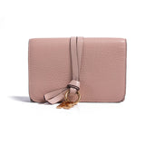 Details: Nude Leather / Gold Tone Hardware / Black Leather Trim / Exterior Pocket at Back / Leather Interior / Bill Compartment / Zipper Pocket / Six Card Slots / Two Interior Pockets / Push Button Closure