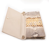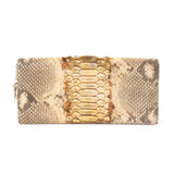 Details: Gold, Grey, and Tan Snake Skin / Brass Hardware / Designer Logo Adornment at Side / Tan Leather Interior Lining / Flat Pocket at Inside / Magnetic Snap Closure at Front