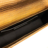 Details: Gold Embossed Leather / Gold-Tone Hardware / Logo at Front with Tassel Embellishment0 / One Compartment with One Pocket / Magnetic Snap Closure at Flap