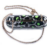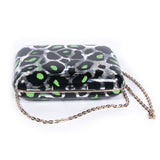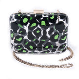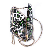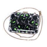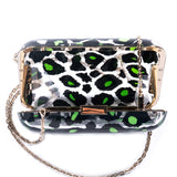 Details: Rectangular Shape / Gold Tone Edges / Gold Tone Snap Closure At Top With Valentino Logo Engraved / Detachable Chain Shoulder Strap / Clasp Fastening / Brass and Plastic Hardware / Black And Green Leopard Print Throughout