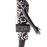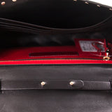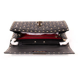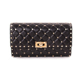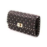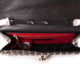 Details: Black Quilted Calf Leather / Gold-Tone Hardware / Detachable Chain-Link Shoulder Strap / Stud Embellishment Throughout / Black and Red Lining / Single Compartment with Zip Closure / Ten Card Slots and One Bill Compartment / Turn-Lock Closure at Front Flap