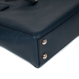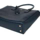 Details: Navy Blue Saffiano Leather / Silver-Tone Hardware / Dual Rolled Handles / Detachable Adjustable Strap / Navy Fabric Lining / One Compartments / Three Pockets at Interior, Two with Zip Closure.