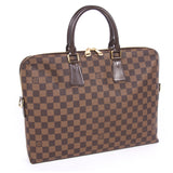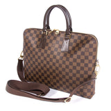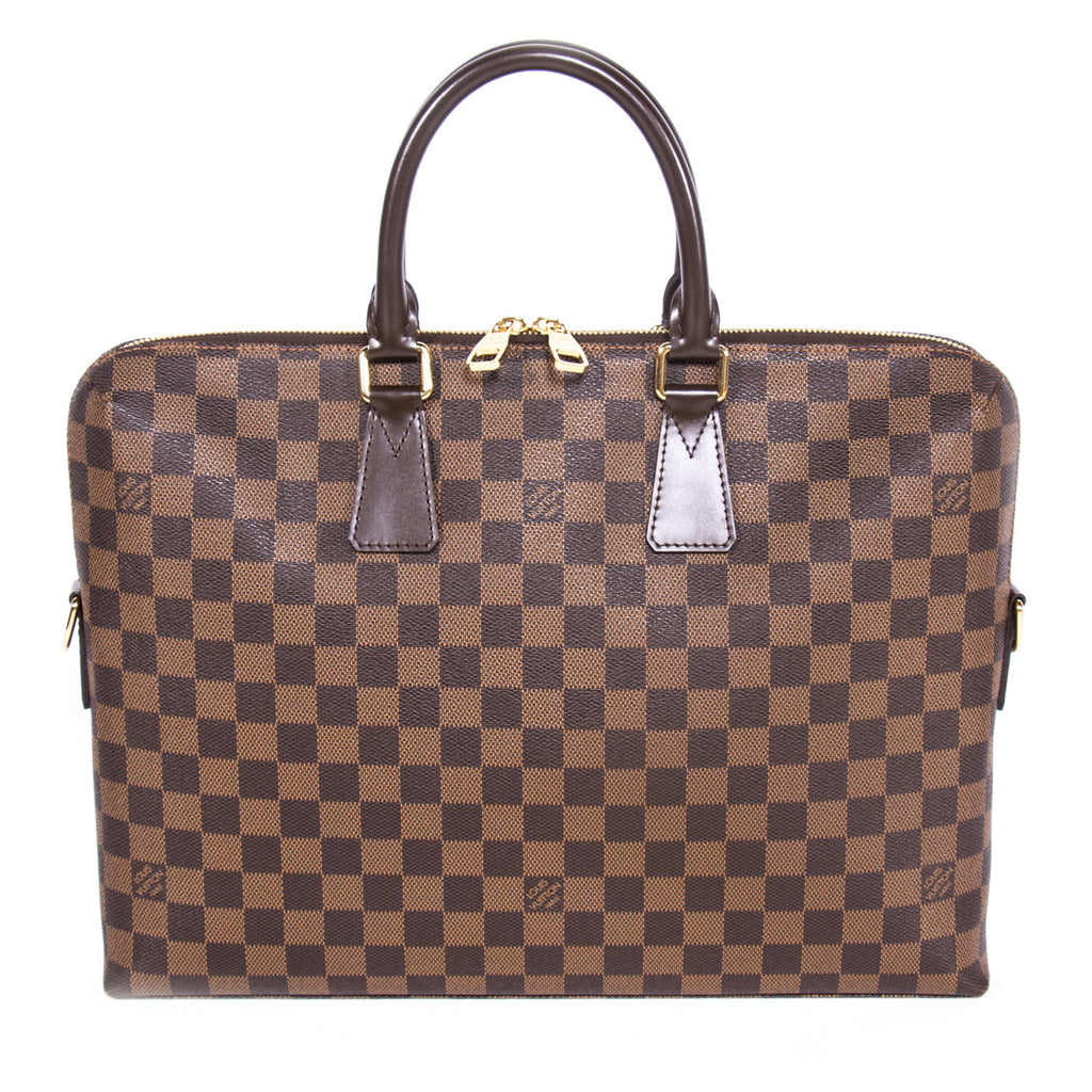 Details: Currently In Stores / Damier Ebene Coated Canvas / Gold Tone Hardware / Detachable Adjustable Shoulder Strap / Brown Cowhide Leather Trim / Dual Brown Cowhide Leather Top Rolled Handles / Brown Interior Woven Lining / Single Large Compartment / Five Interior Flat Pockets Including One iPad-Sized / Double Pen Loop / Double Zip Closure At Top / Discreetly Signed Shoulder Strap
