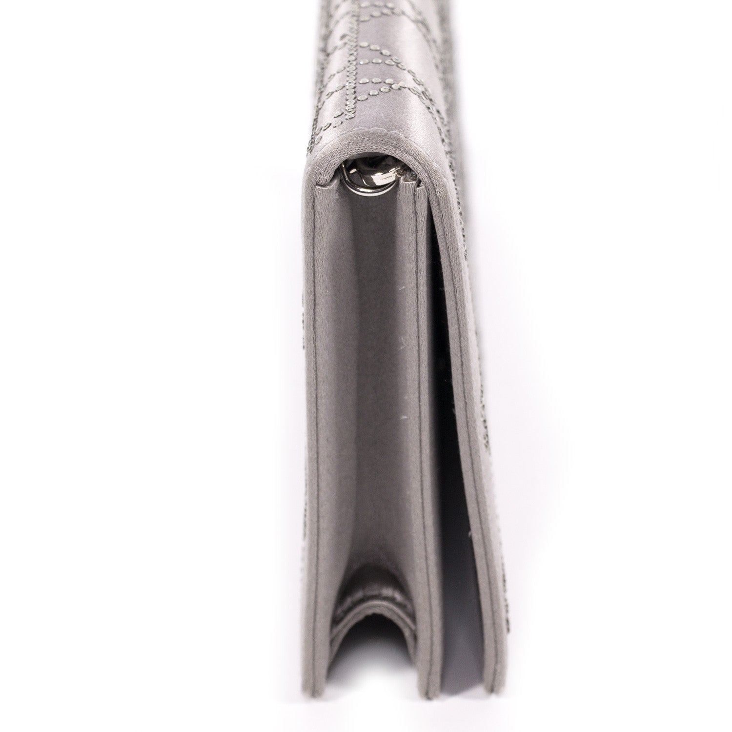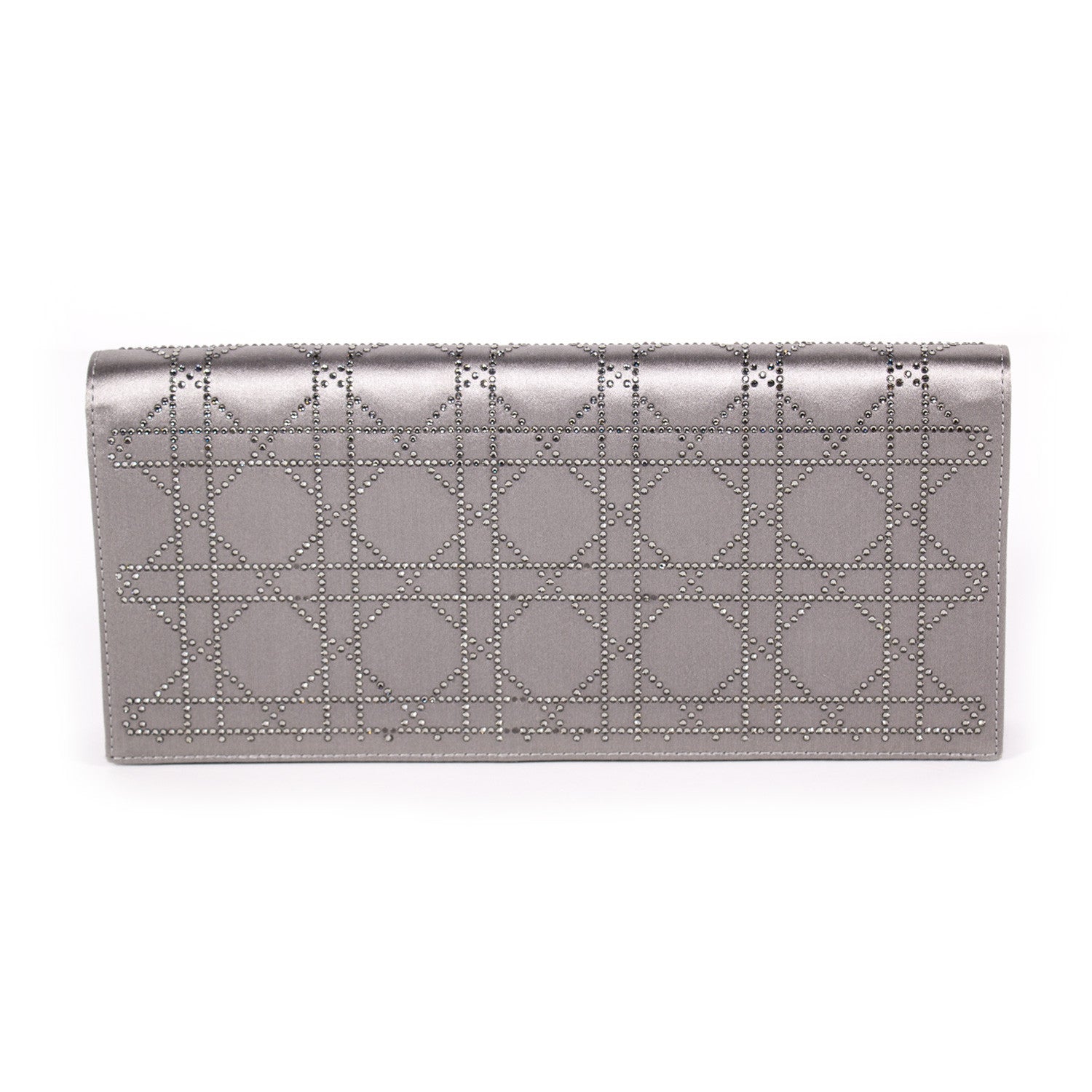Details: Grey Cannage Satin / Silver Tone Hardware / Crystal Embellishment At Front And Back / Detachable Shoulder Strap / Grey Satin Lining At Interior / Single Compartment / Single Slit Pocket / Magnetic Snap Closure At Front