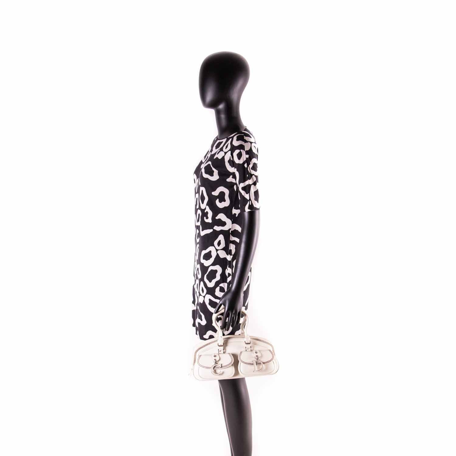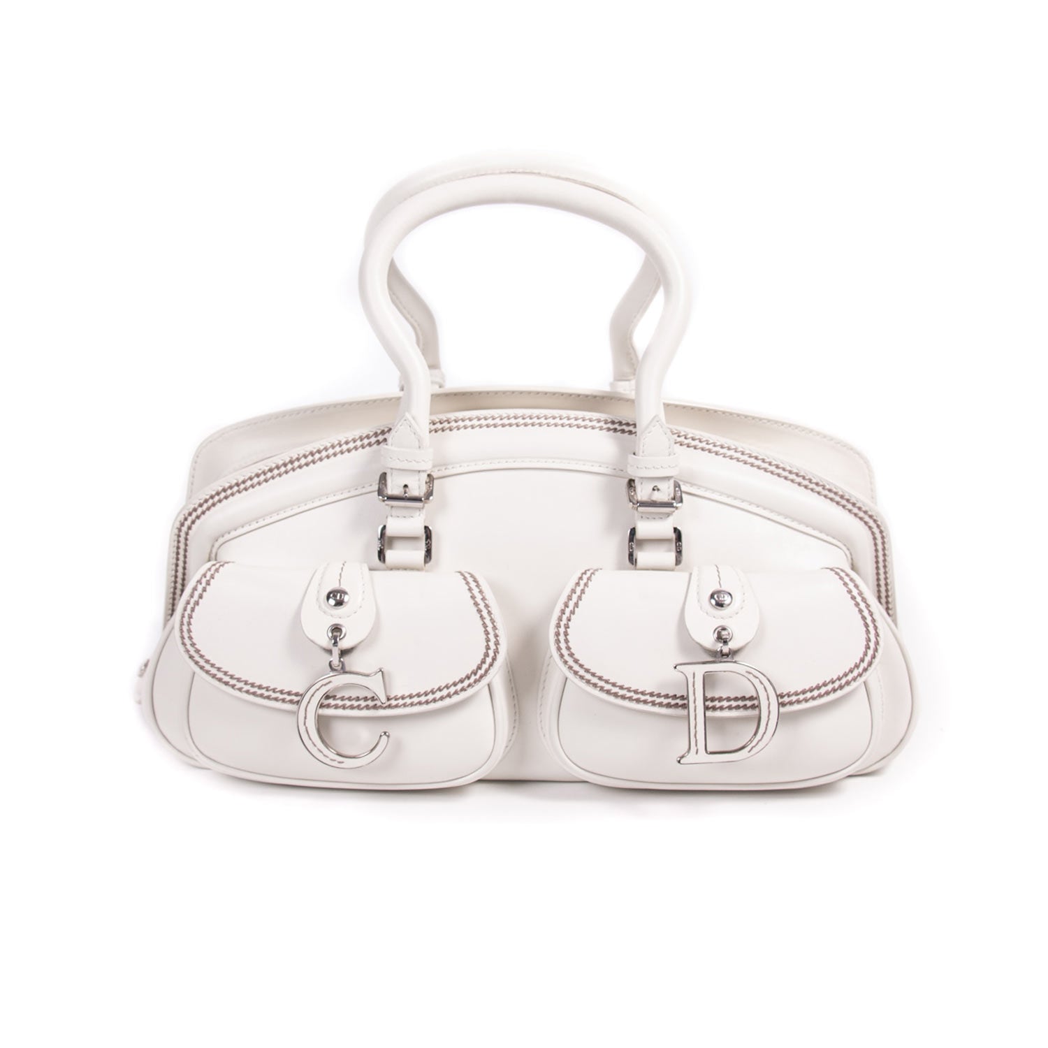 Details: White Soft Leather / Silver-Tone Hardware / Dual Rolled Handles / Dual Pockets at Exterior with C & D Letters / Protective Studs at Base / Woven Print Lining / Dual Pockets at Inside / Zipper Closure at Top