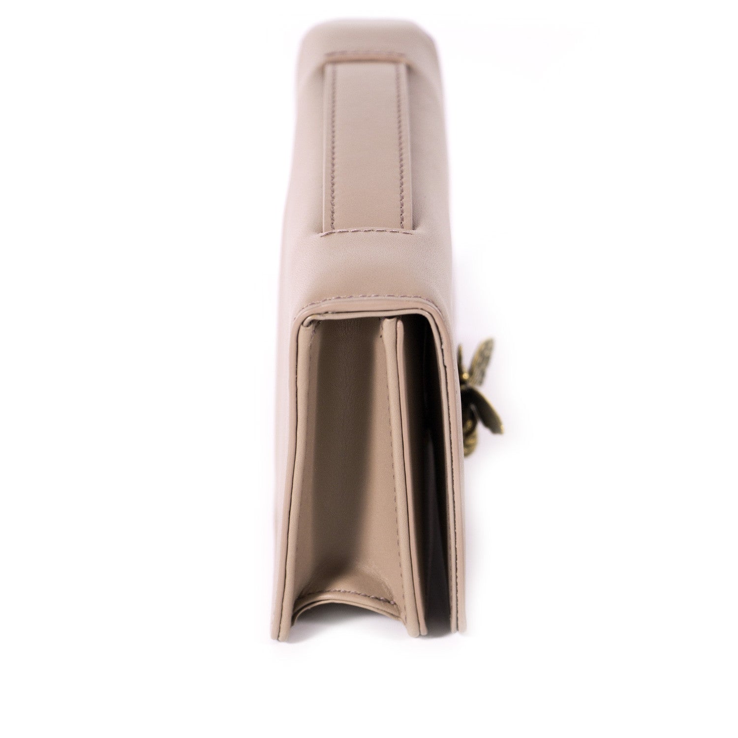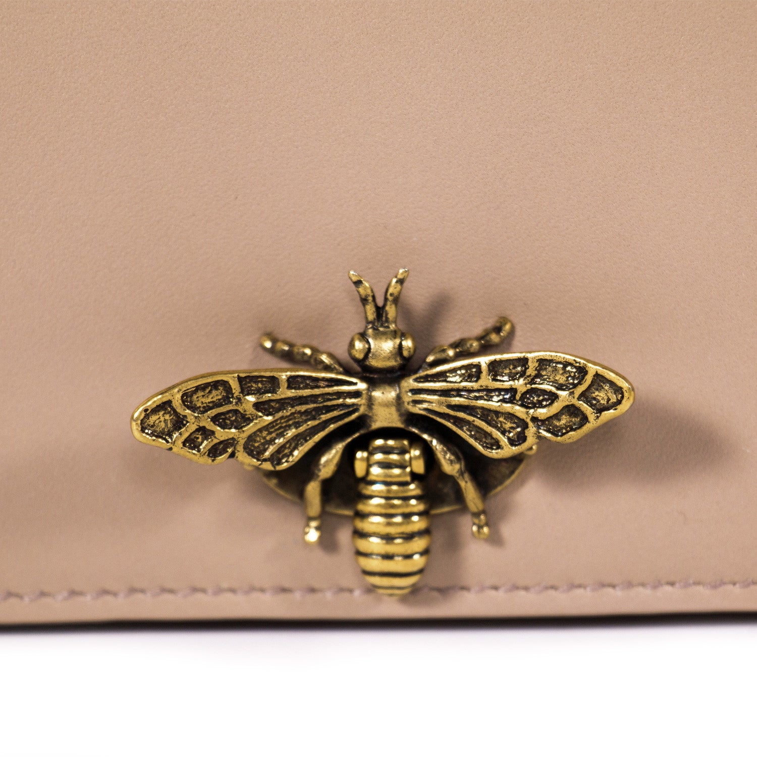 Details: Nude Calfskin Leather / Brass Hardware / Bee Embellishment At Front Face / Top Handle / Single Compartment With Single Slit Pocket / Flip Lock Closure At Front Flap