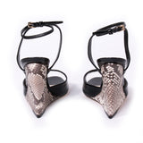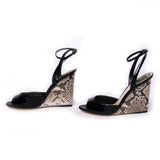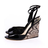 Details: Escapade Black Patent Leather / Strappy Wedge / Inside Leather Lining / Tonal Stitching Throughout / Gold Tone Buckle At Ankle / Python Skin Covered Wedge