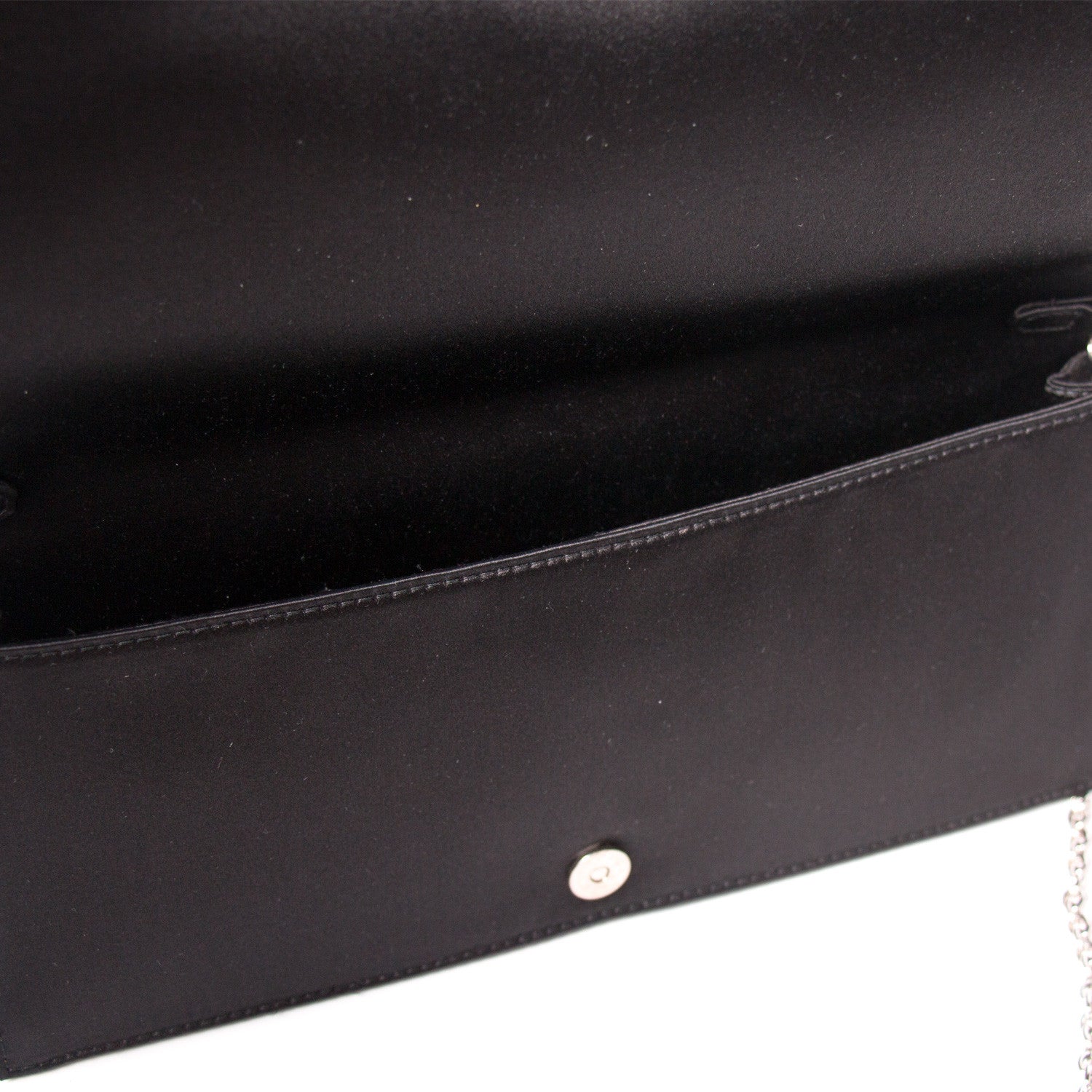Details: Black Cannage Satin / Crystal Embellishment Throughout / Cannage Pattern / Detachable Shoulder Strap / Satin Interior Lining / Single Compartment / Slit Pocket / Magnetic Snap Closure at Front Flap