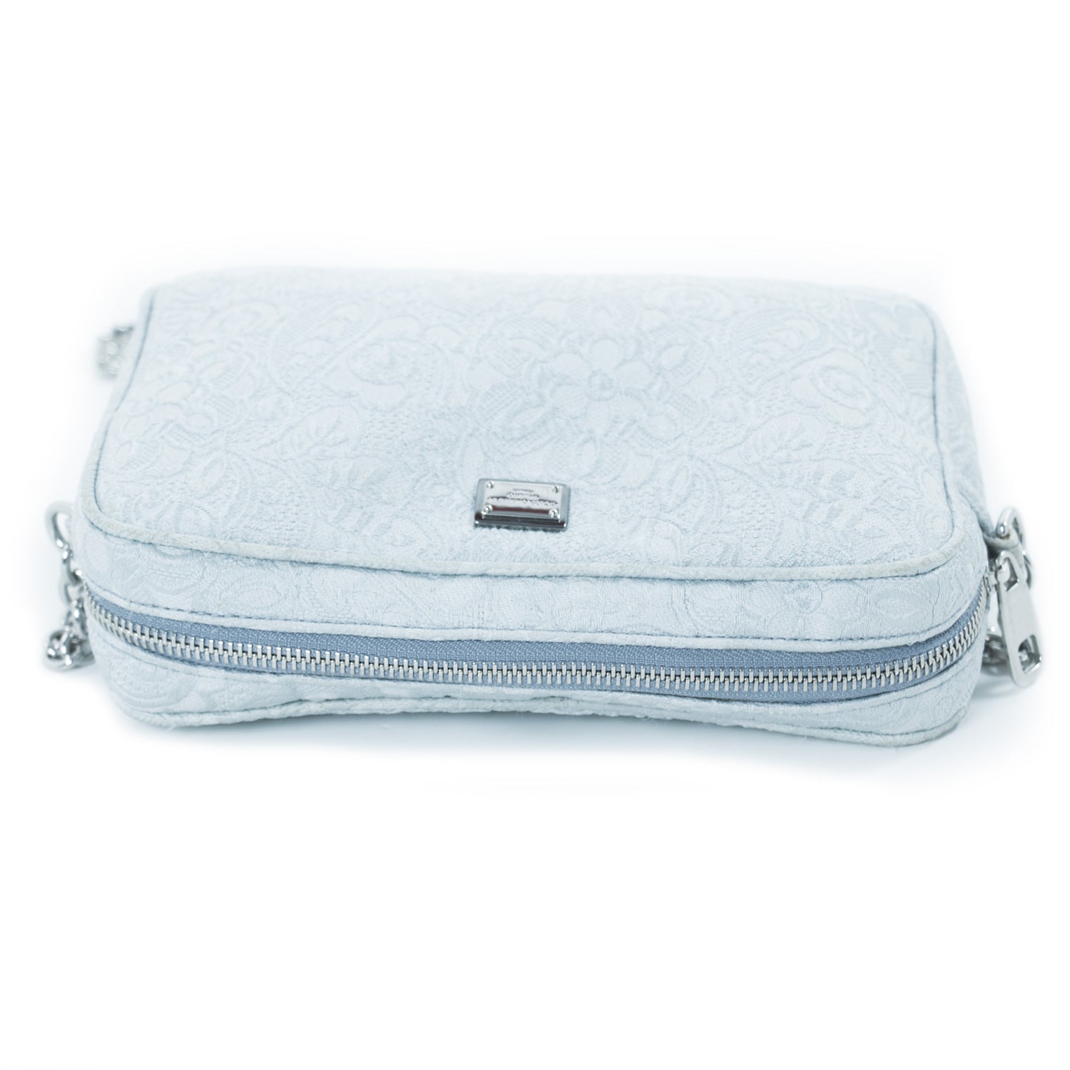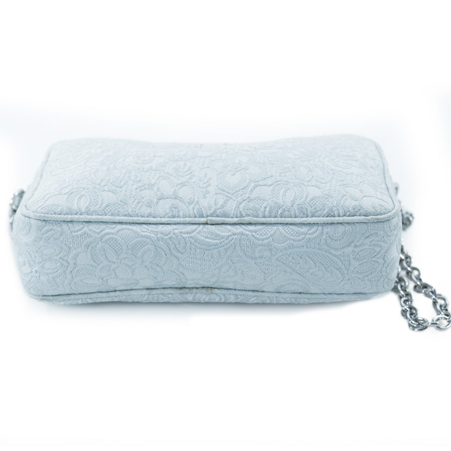 Details: Light Blue Fabric / Silver-Tone Hardware / Metal Plate Logo at Front / Long Chain Strap / Grey Satin Lining with Leopard Prints Flat Pocket / Zipper Pocket at Inside / Zipper Closure at Top