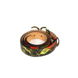 Details: Black Leather / Gold and Silver-Tone Hardware / Printed Flowers in Green and Red Throughout / Logo Buckle