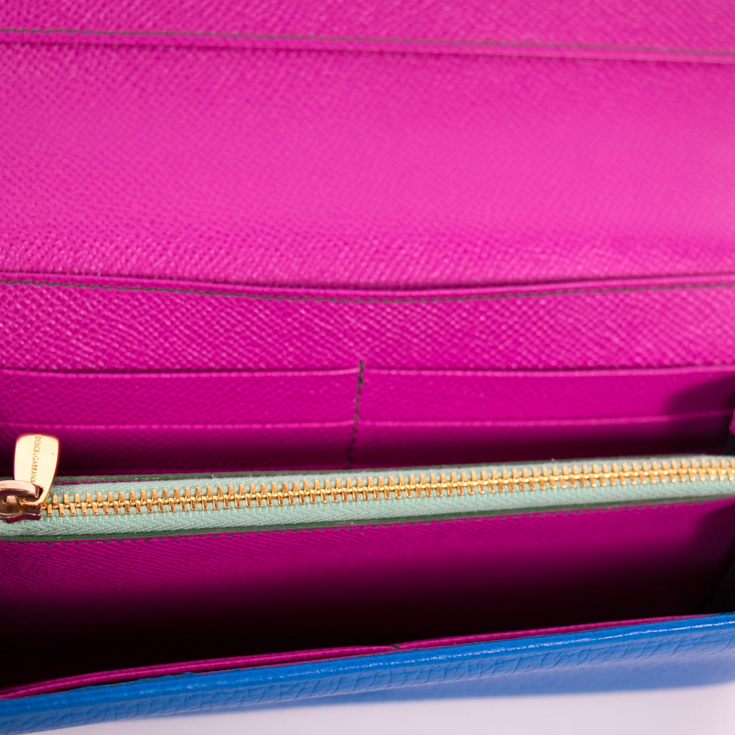 Details: Blue And Pink Grained Leather / Gold Tone Hardware / Detachable Chain Link Shoulder Strap / Yellow Leather Single Flat Top Handle / Gold Tone Logo Plate At Front / Pink Leather Interior Lining / Three Interior Compartments, One With Zip Closure / Twelve Card Slots / Two Flat Pockets, One Under The Front Flap / Foldover Top With Snap Closure