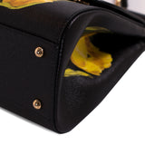 Details: Black Leather with Yellow Tulip Prints Throughout / Gold-Tone Hardware / Detachable and Adjustable Shoulder Strap / Single Rolled Handle / Black Fabric Interior Lining / Zipper and Dual Flat Pockets / Magnetic Snap Closure at Top