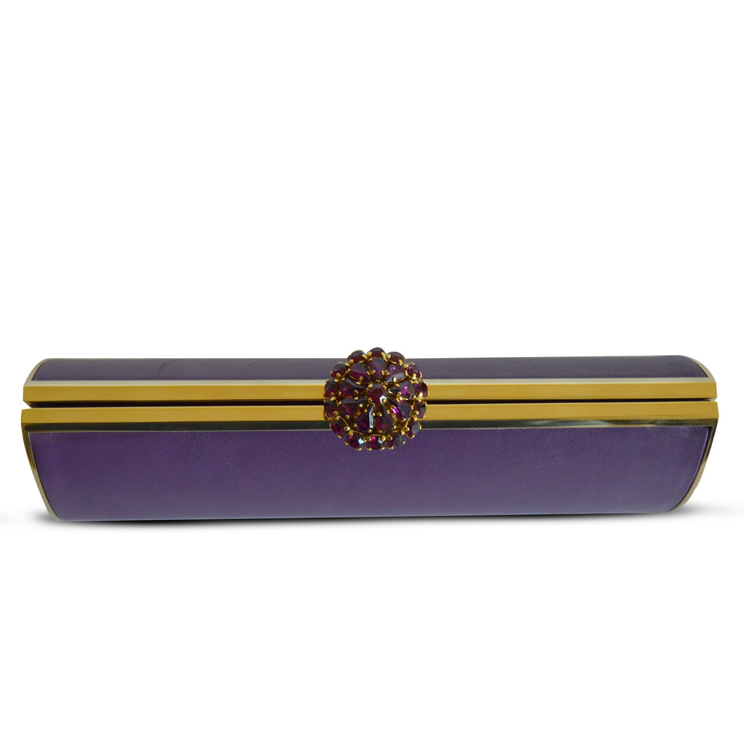 Details: Purple Smooth Leather / Gold-Tone Hardware / Crystal Flower Snap Closer With Push Button / "Elie Saab" Gold Tone Engraved Plate On The Interior