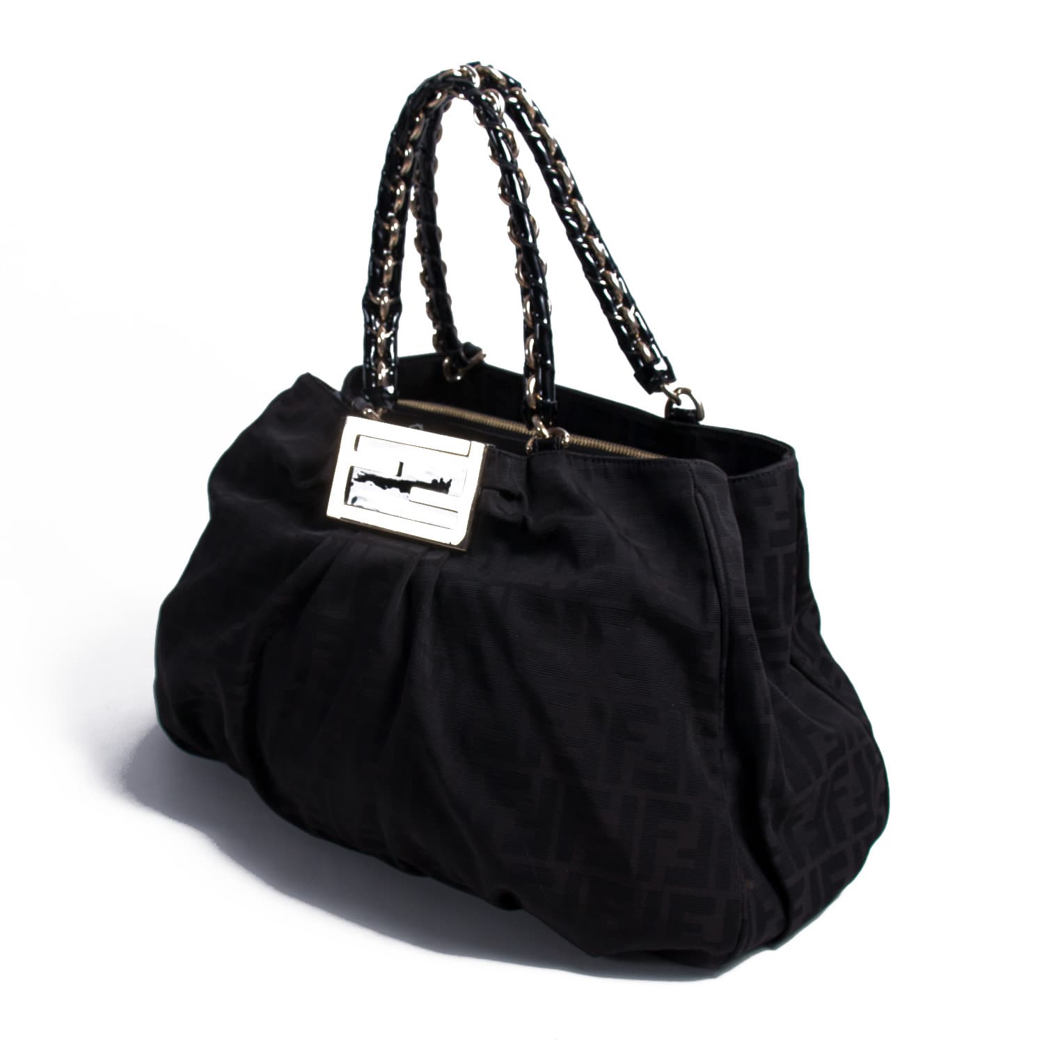 Details: Black Fabric Canvas / Light Gold-Tone Hardware / Dual Chain-Link and Metallic Leather Handles / Metal Plate at Front Face / Logo Prints Throughout / Brown Fabric Lining / Three Compartments, One with Zipper Closure / Dual Slit Pockets