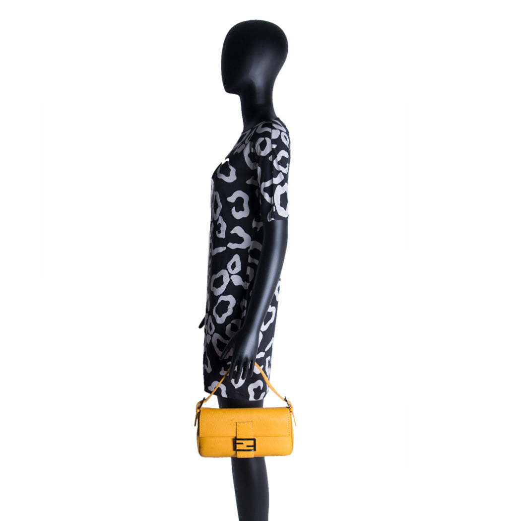 Details: Yellow Grained Leather / Silver-Tone Hardware / Adjustable Shoulder Strap / Logo at Front / Brown Suede Interior Lining / Zipper and Flat Pocket / Magnetic Snap Closure at Flap
