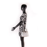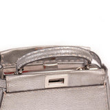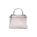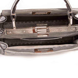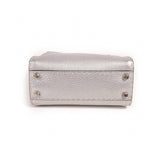 Details: Silver Metallic Leather / Silver-Tone Hardware / Single Rolled Handle / Detachable Shoulder Strap / Black Leather Trim / Dual Interior Compartments / Grey Suede Lining / Zipper Pocket at Inside / Dual Turn-Lock Closures at Top