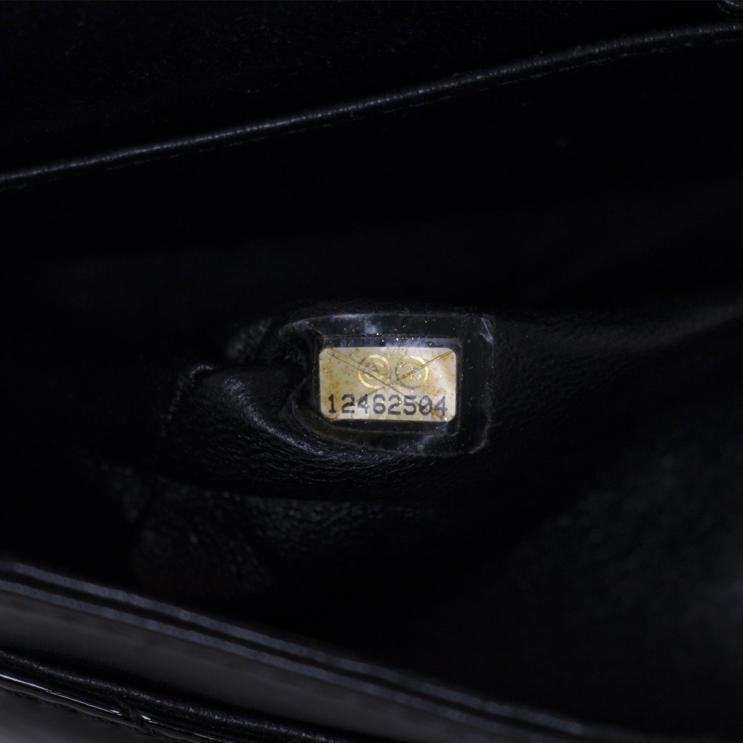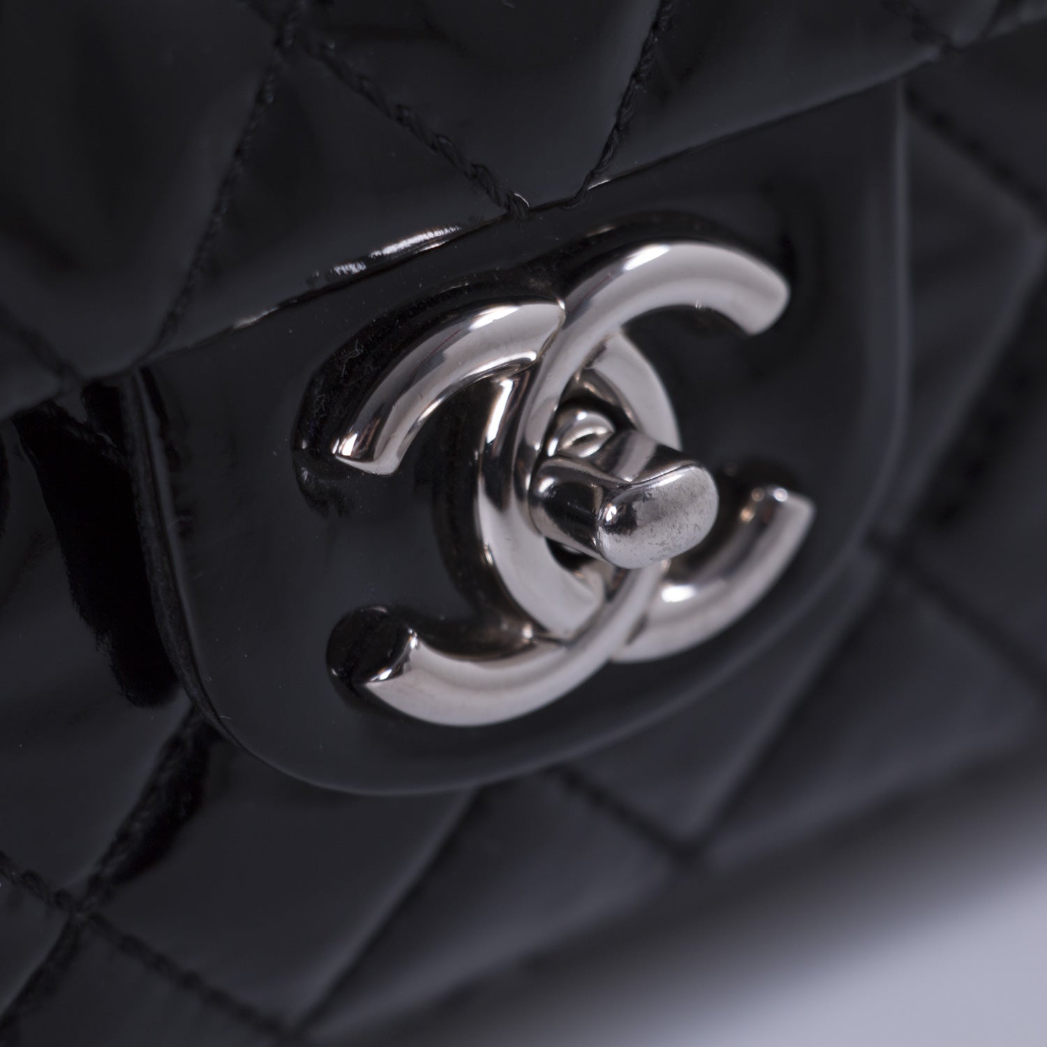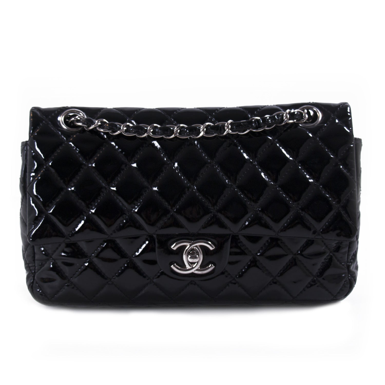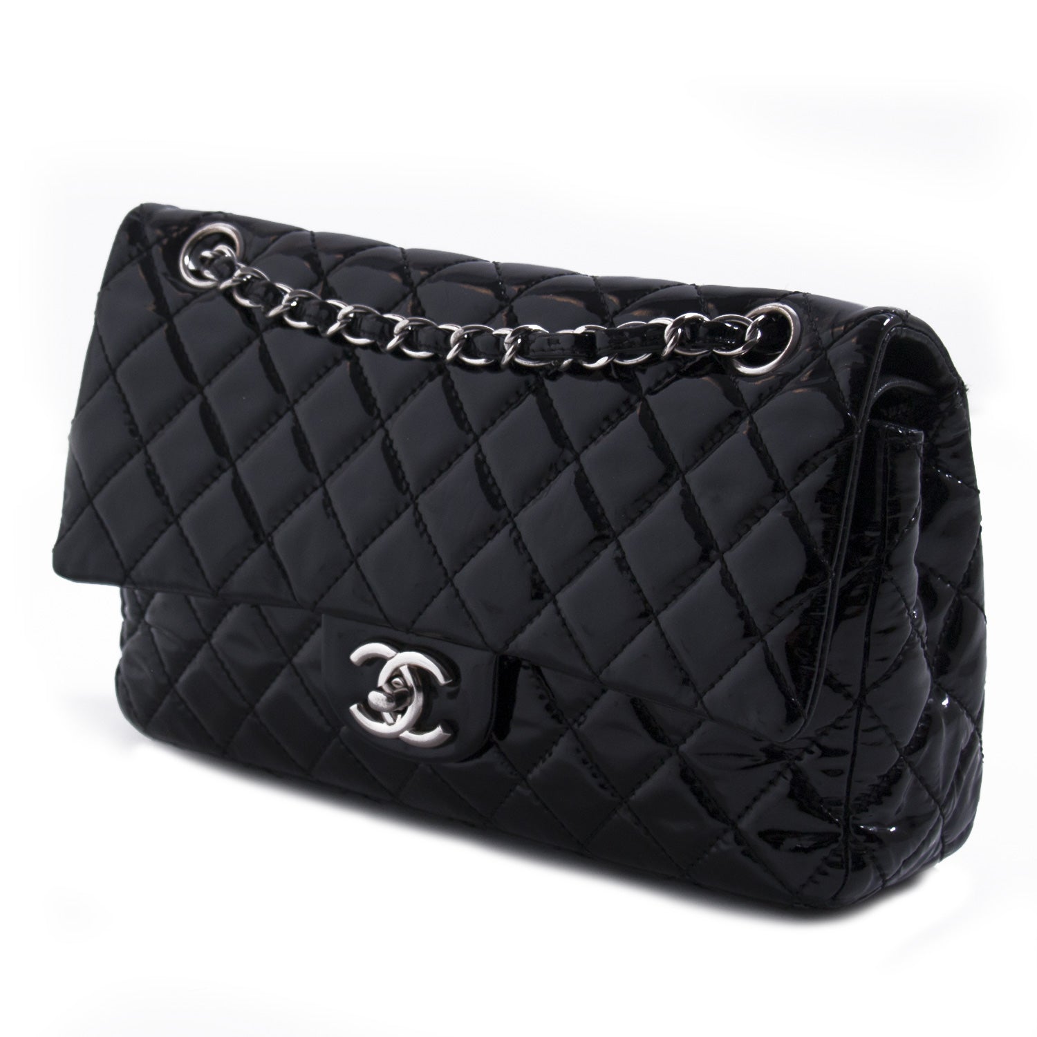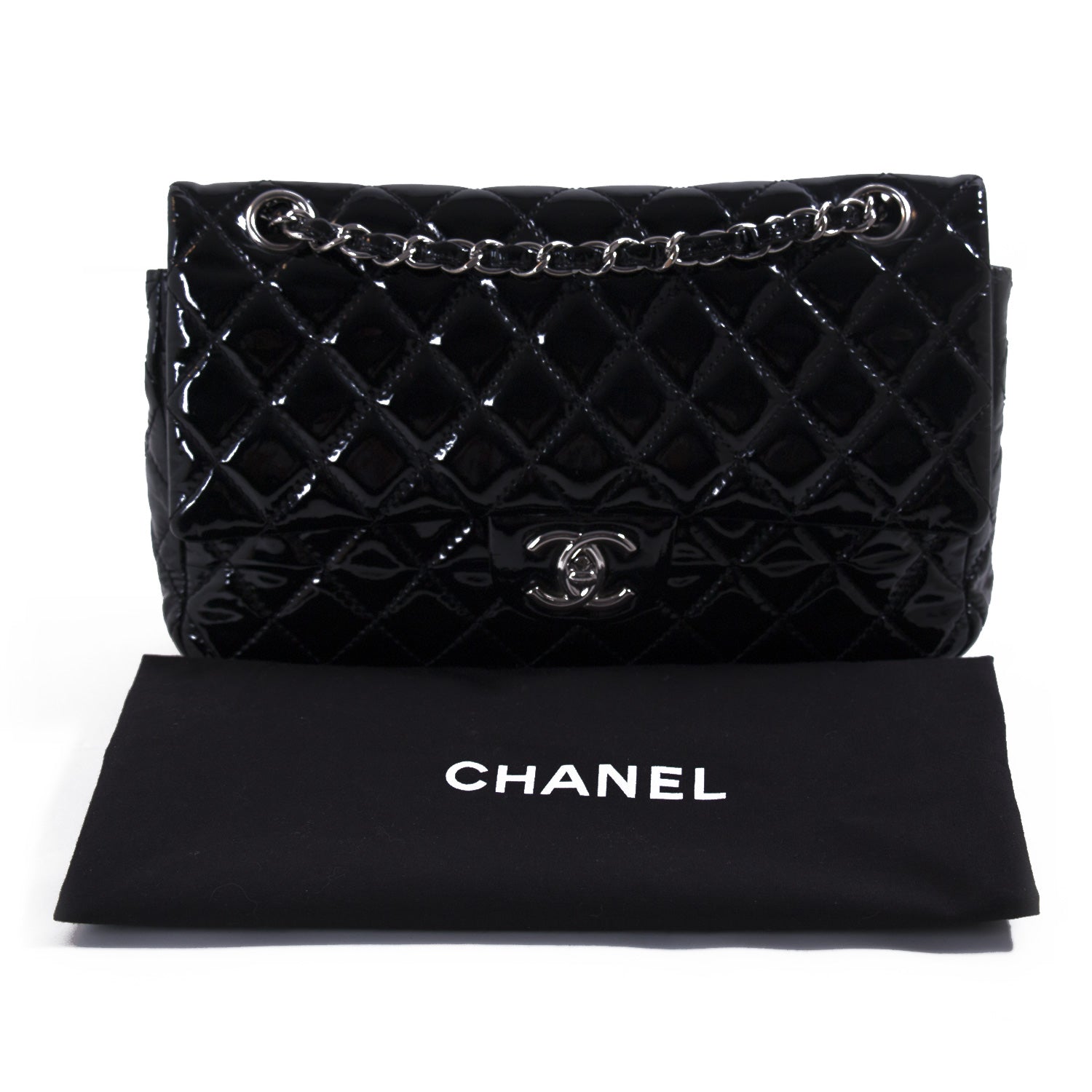 Details: Black Quilted Patent Leather / Silver-Tone Hardware / Dual Chain-Link Leather Shoulder Strap / Exterior Pocket at Back / Dual Compartments with Two Flat Pockets / Dual Flap Closure with Push-Button and Turn-Lock Closure