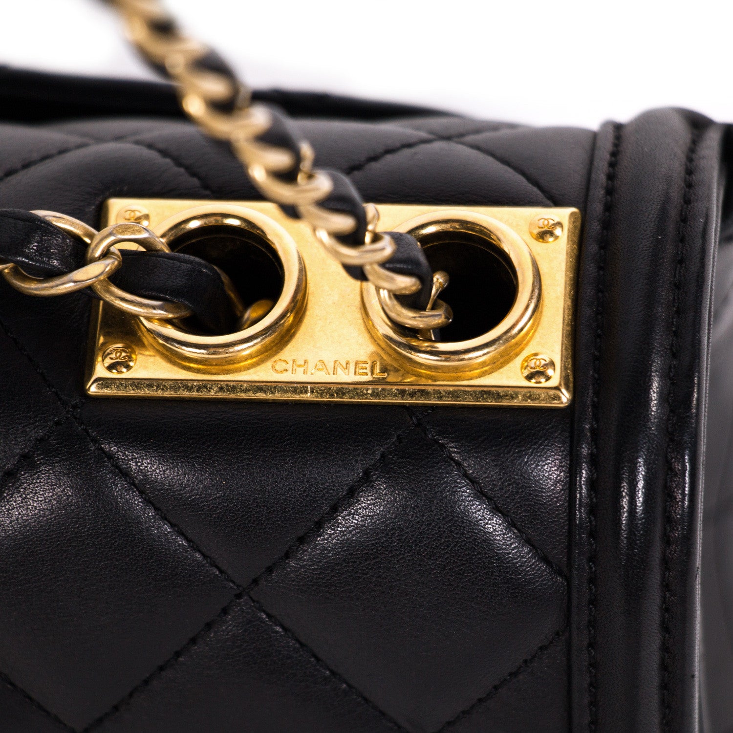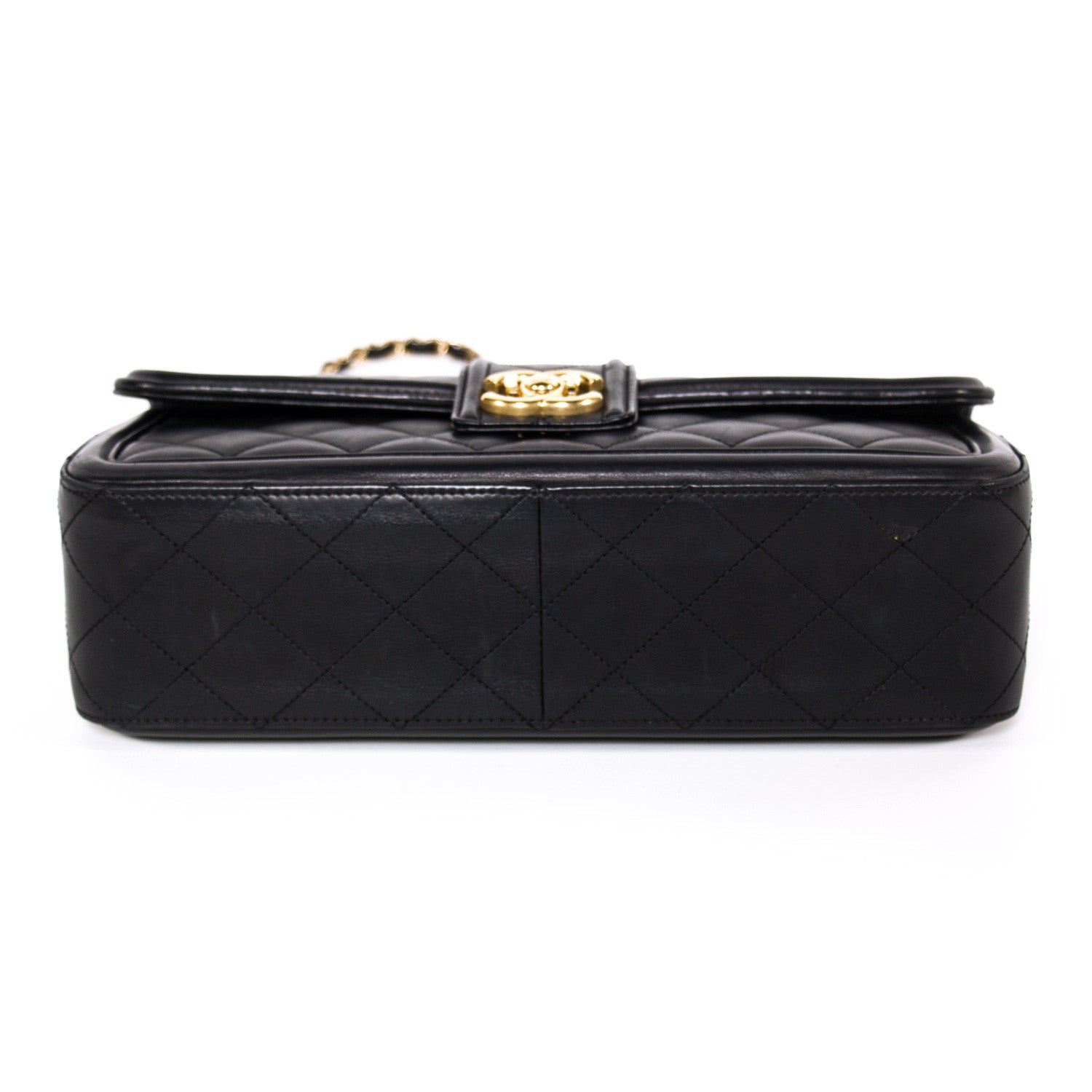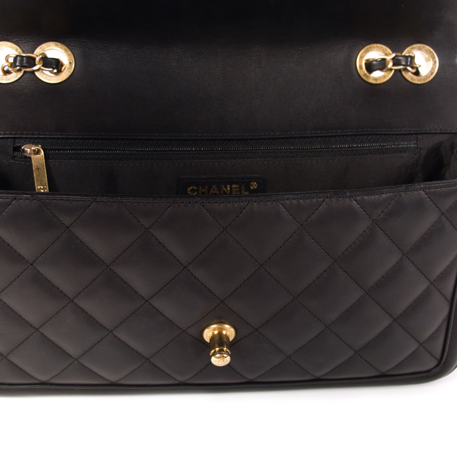 Details: Pre-Spring Summer 2015 Collection / Black Calfskin Quilted Leather With Gold-Tone Hardware / Single Chain-Link Shoulder Strap With Leather Accent And Leather Pad/ Exterior Flat Pocket At Exterior / Black Fabric Interior Lining / Single Compartment With Single Zip Pocket / Flap Closure At Front With Gold Chanel CC Press Lock