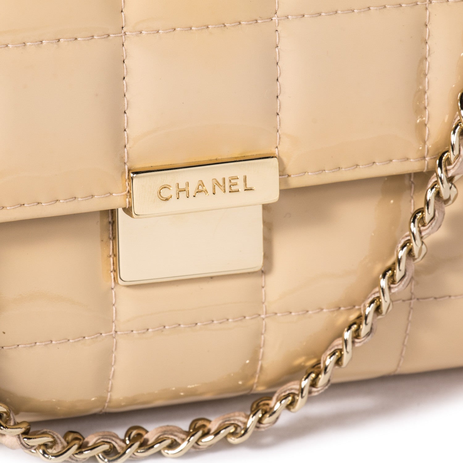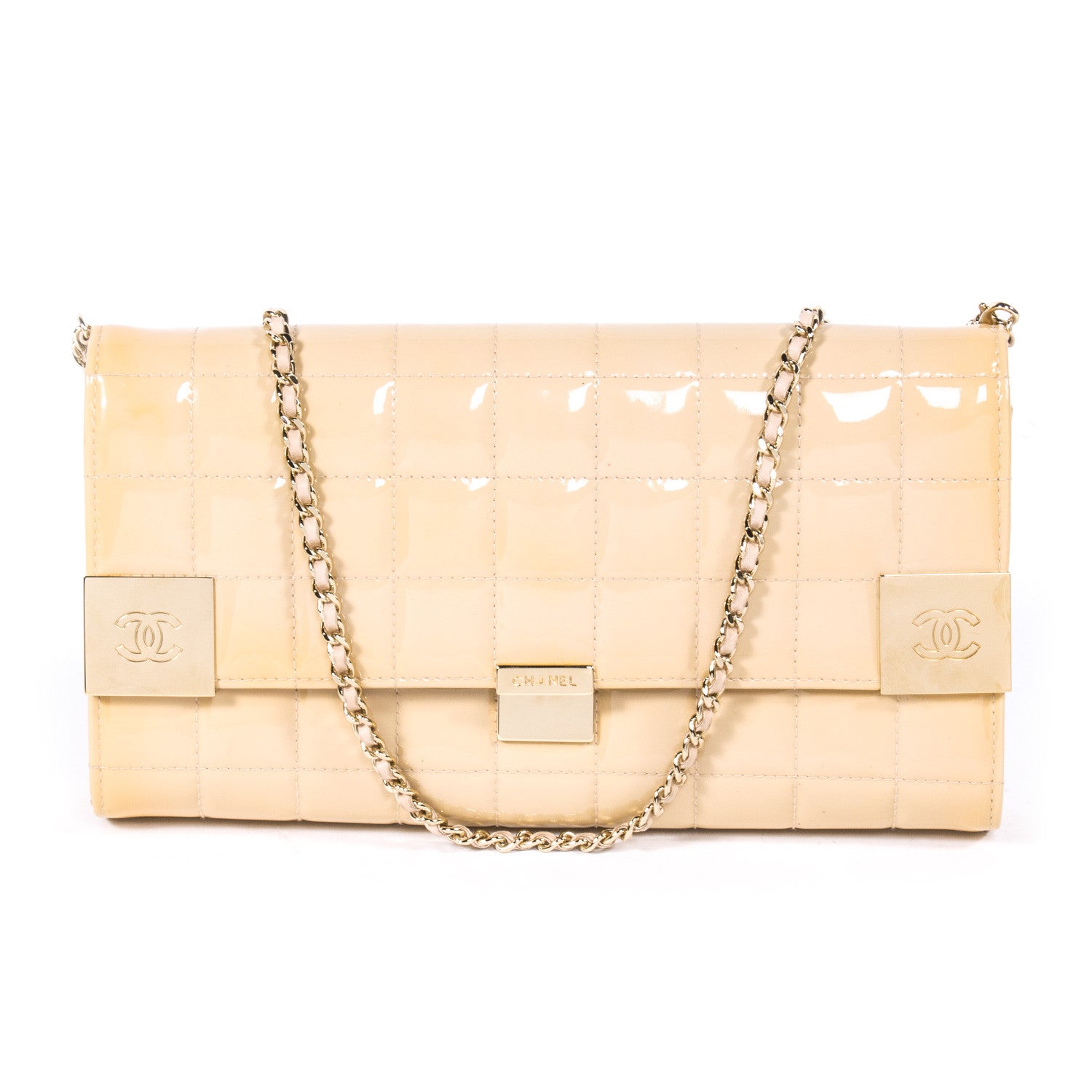 Details: Nude Patent Leather / Shoulder Bag With Removable Shoulder Strap / Chain Link With Leather / Gold Tone Hardware / Fold Over With Snap Closure / Single Compartment With Dual Slit Pockets At Interior Wall / Interior Calfskin Leather