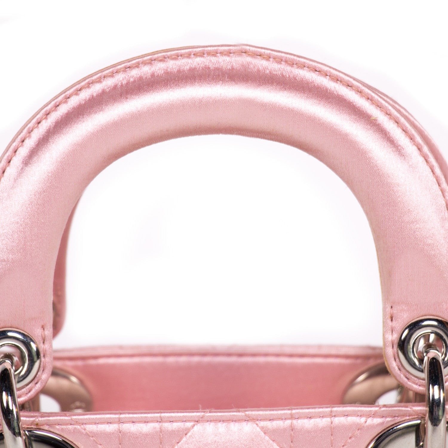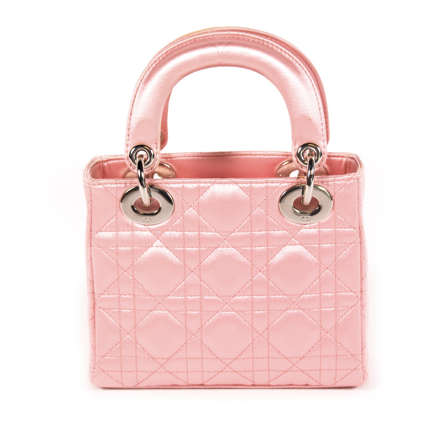 Details: Pink Satin In Cannage Pattern / Silver-Tone Hardware / Dual Rolled Handles / Designer Logo Charm At Front / Tonal Grey Jacquard Lining At Interior / Single Zip Pocket At Interior / Flap Closure At Top
