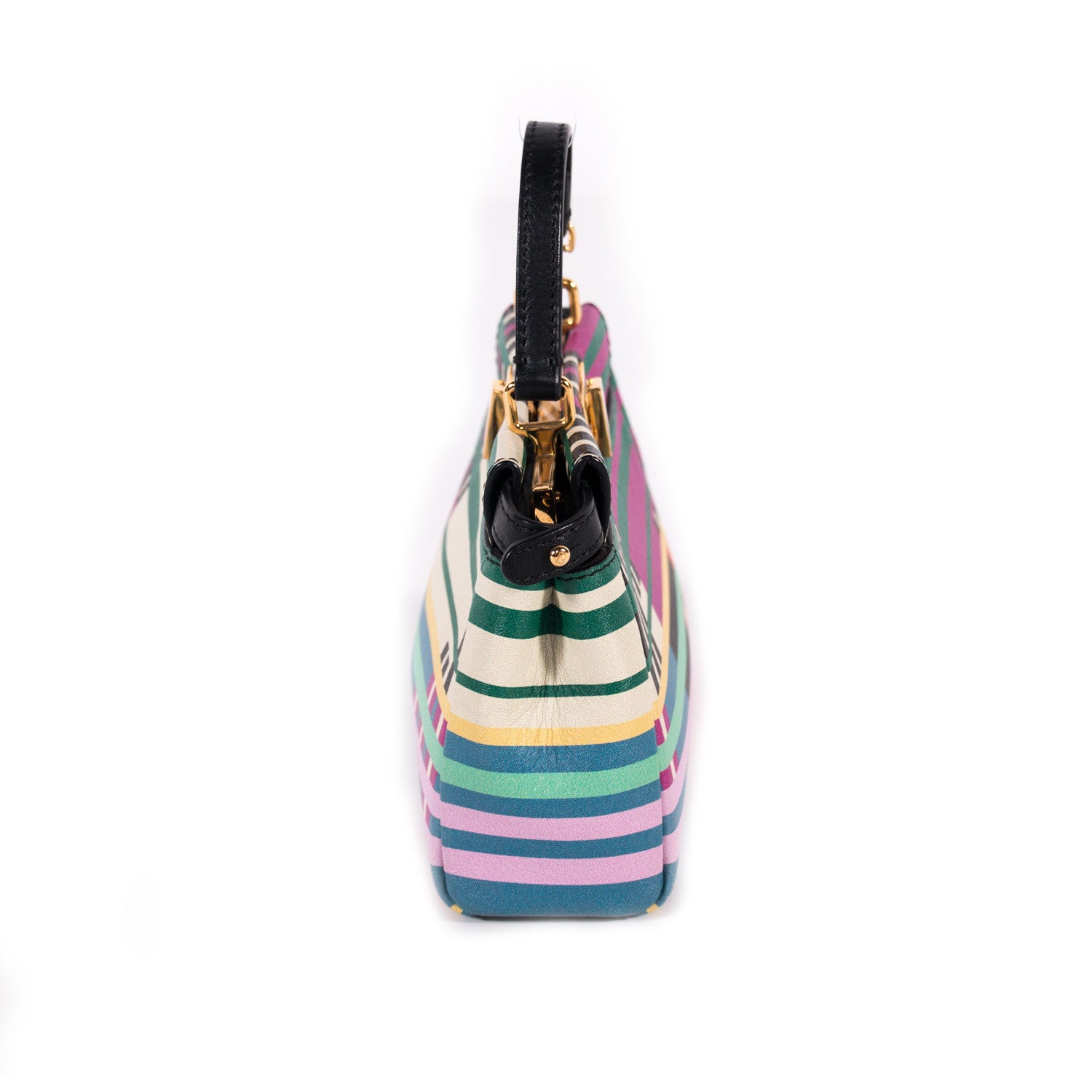 Details: Multicolor Nappa Leather / Gold-Tone Hardware / Removable Adjustable Shoulder Strap / Single Rolled Top Handle / Dual Small Compartment / Black Microfiber Lining / Dual Interior Card Slots / Turn Lock Closure At Front / Snap Closure At Back