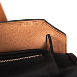 Details: Black Canvas / Brown Leather Trim / Silver-Tone Hardware / Dual Rolled Handles / Detachable Shoulder Strap / Zipper Pocket at Exterior Back / Single Compartment at Inside with Detachable Pouch / Pull-Through Closure at Front
