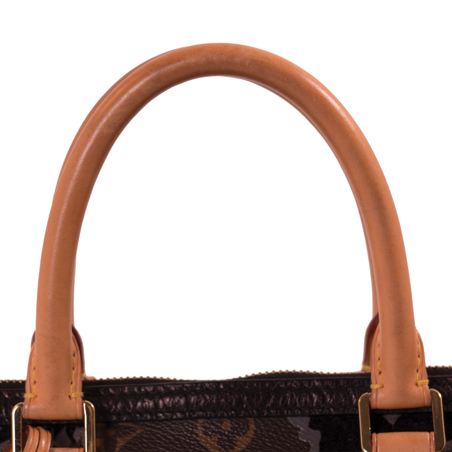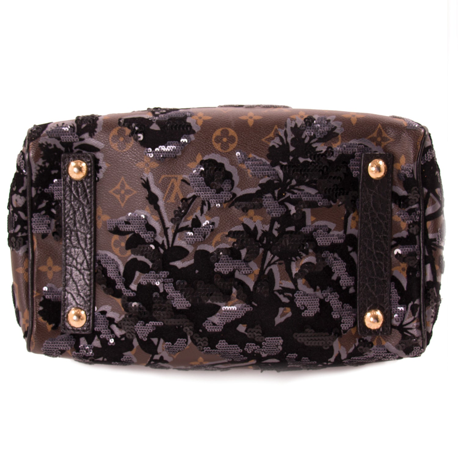Details: Brown Monogram Coated Canvas / Grey Silkscreen with Black Floral Sequin and Velvet Flocking Throughout the Exterior / Gold-Tone Hardware / Black Leather Trim / Dual Rolled Handles / Brown Fabric Lining / Slit Pocket at Inside / Zip Closure at Top