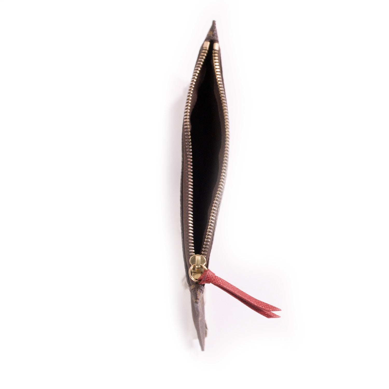 Details: Brown And Tan Monogram Coated Canvas Leather / Brass Hardware / Red leather Trim / Four Card Slots / Three Bill Compartments / Removable Zip Pouch / Red Snap Closure At Front