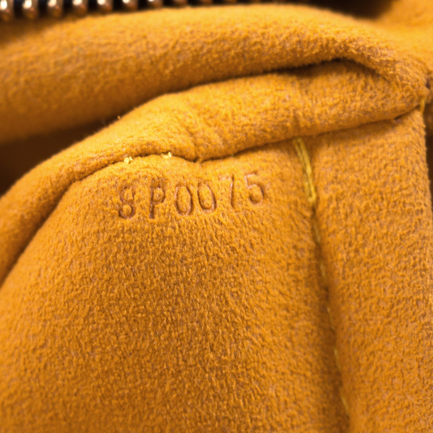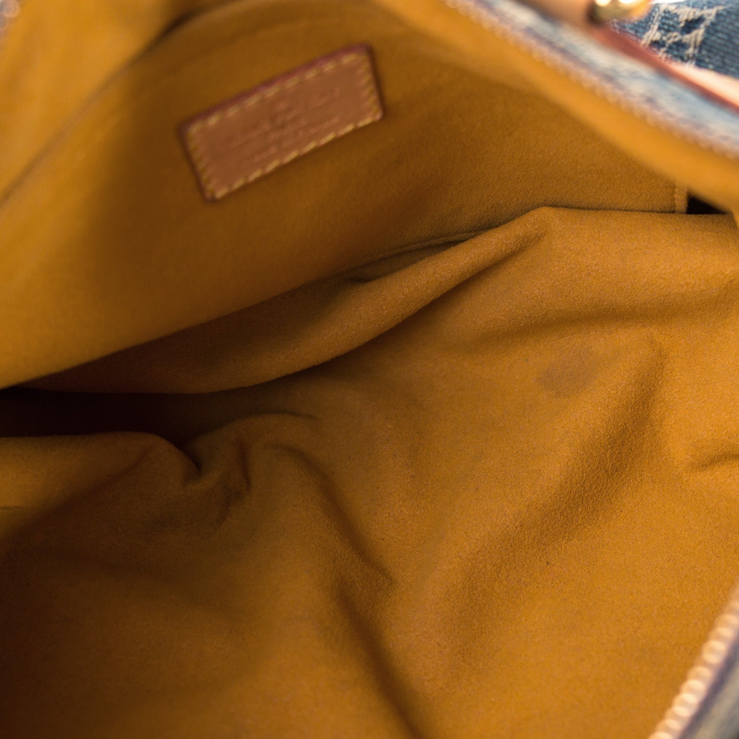 Details: Blue Monogram Denim / Brass Hardware / Tan Vachetta Leather Trim / Dual Rolled Handles / Three Pockets at exterior, One with Zipper / Yellow Mustard Alcantara Lining / Single Pocket at Interior / Zip Closure at Top