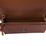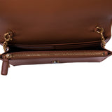 Details: Brown Gold Calf Leather / Gold Tone Hardware / Logo and Tassel Endowment at Front / Chain Shoulder Strap / Two Compartments, One with Zipper / Flat Pocket and Card Slots / Magnetic Snap Closure at Flap
