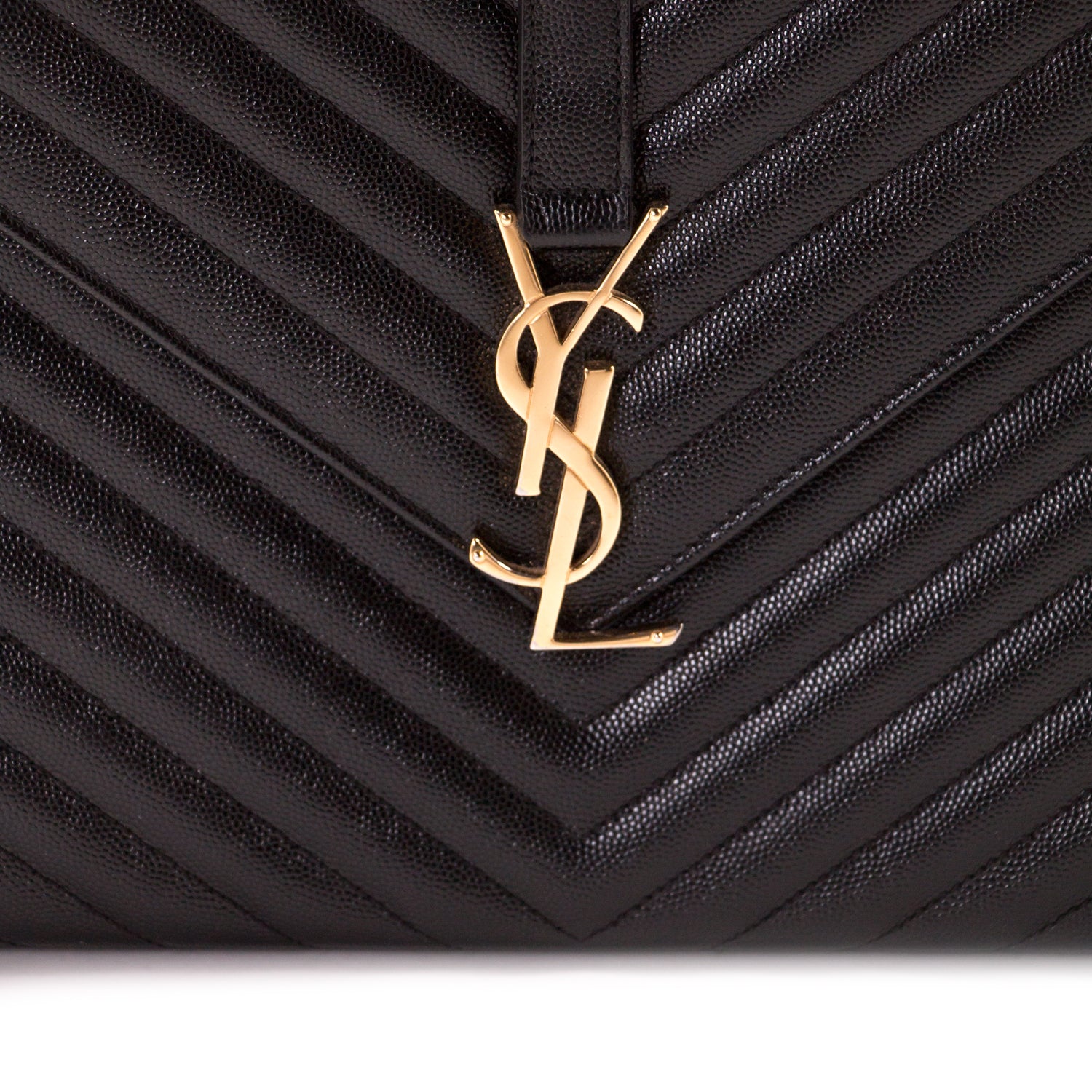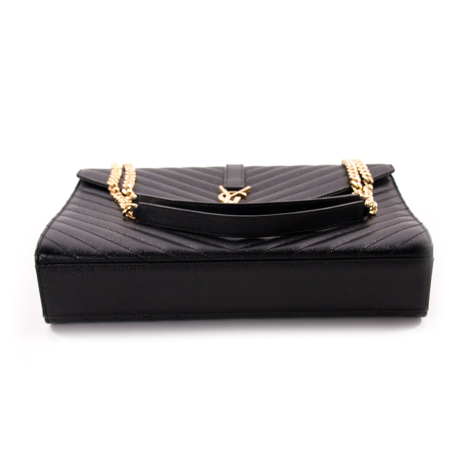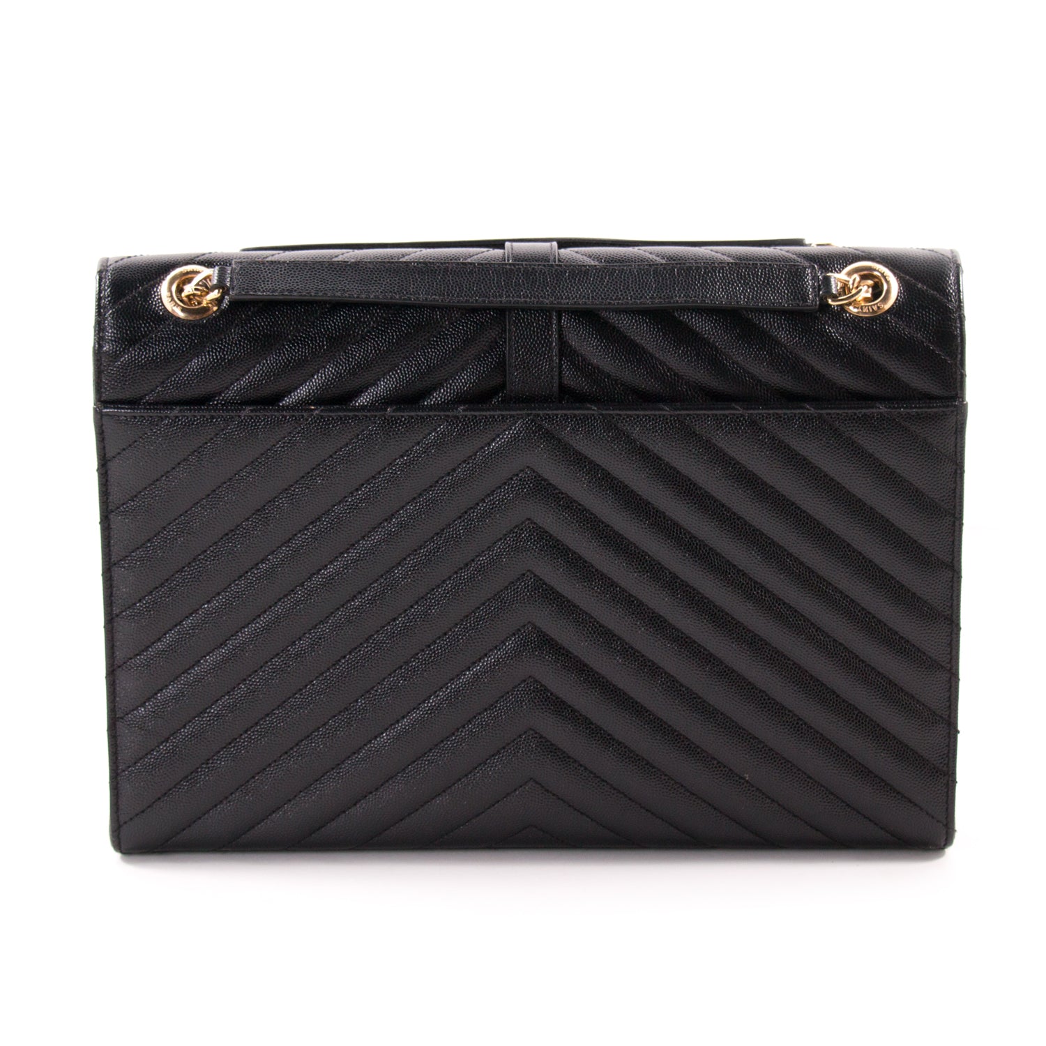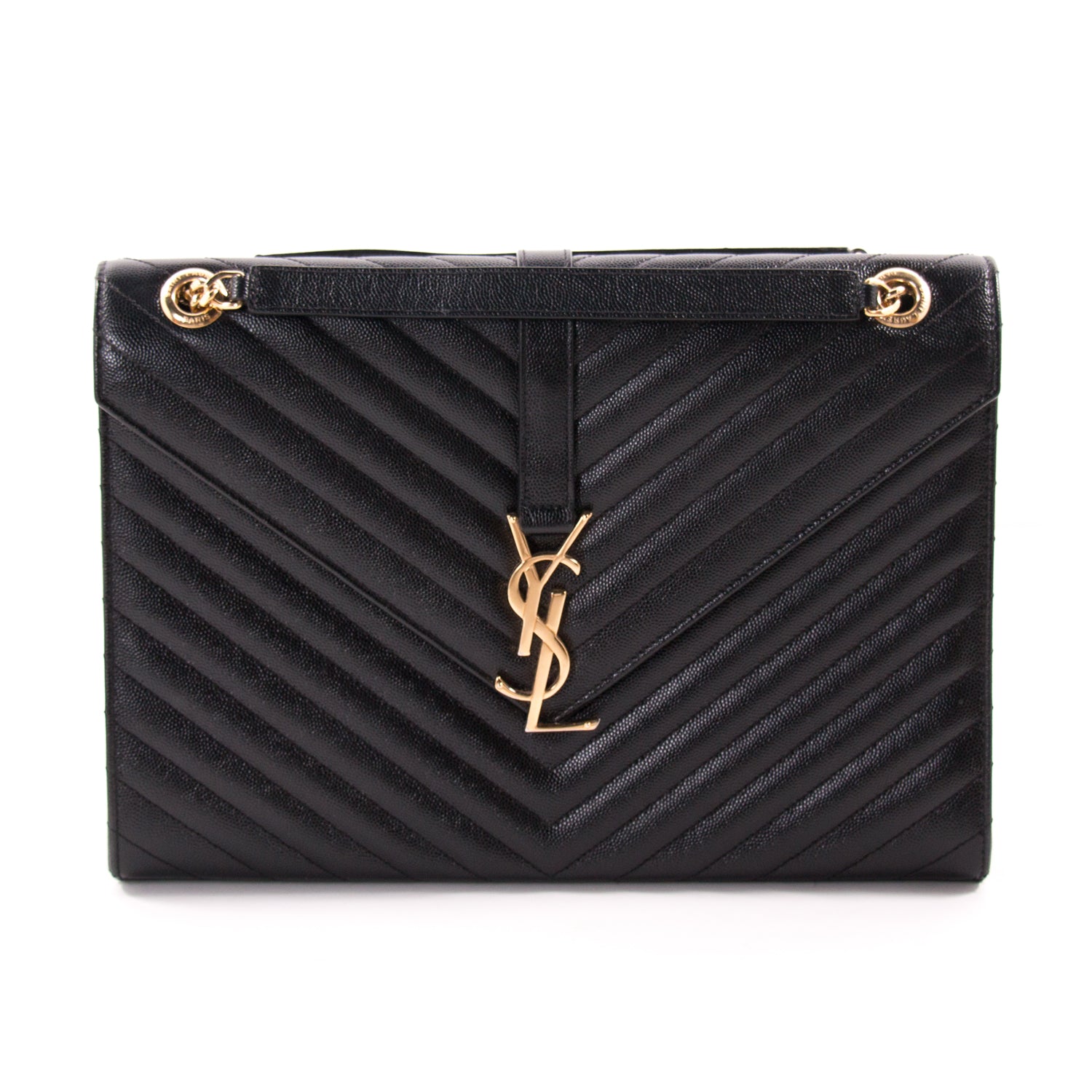Details: Chevron Black Quilted Leather / Gold Tone Hardware / Dual Chain-Link And Leather Shoulder Strap / Exterior Pocket At Back / YSL Adornment Logo At Front / Single Compartment / Single Zip Pocket / Magnetic Snap Closure At Front Flap