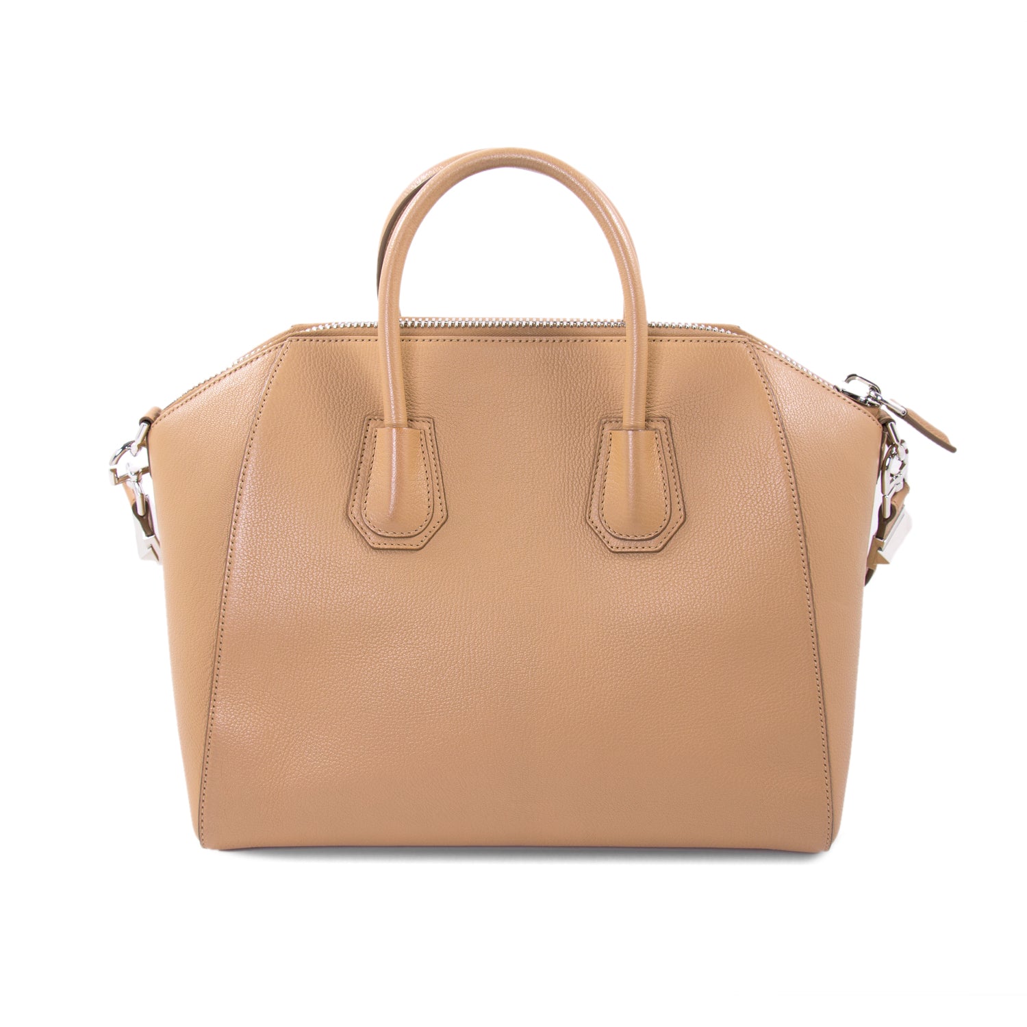 Details: Brown Tan Goatskin Leather / Silver-Tone Hardware / Dual Rolled Handles / Detachable Shoulder Strap / Logo at Front / Beige Fabric Interior Lining / Two Flat Pockets and One Zipper Pocket at Inside / Zipper Closure at Top